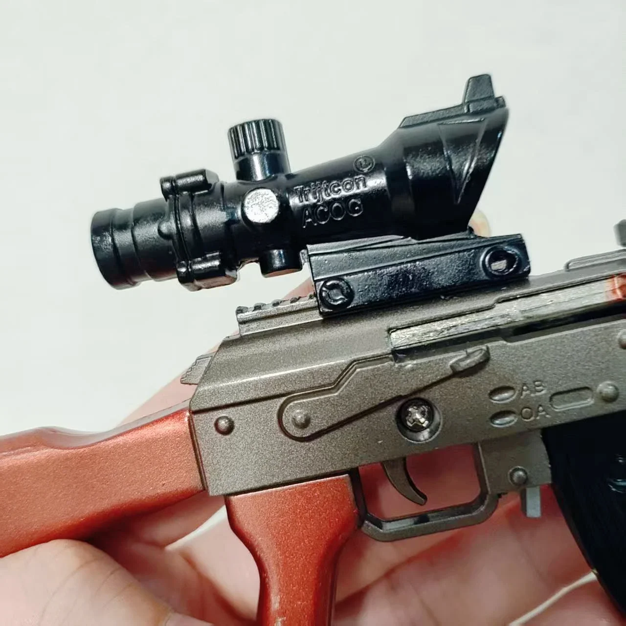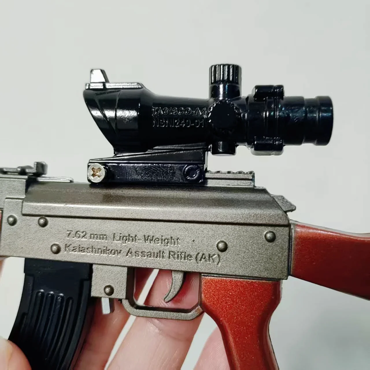 Enhance your collection with this highly detailed miniature replica of the iconic AK47 rifle. Measuring approximately 30 centimeters, it features a sleek metallic construction that vividly captures the modern, tactical aesthetic. The body showcases a striking two-tone finish: the barrel, upper receiver, and scope are finished in polished gunmetal gray, providing a cool, industrial look. Meanwhile, the stock, pistol grip, and handguard are painted in a matte reddish-copper hue, adding warmth and depth to the design. Carefully crafted, this model emphasizes realistic details such as the scope mounted on top, with a black finish and a small adjustment knob. Ideal for adult collectors, it also doubles as an impressive decorative piece or gift to display on desks, shelves, or gun displays, showcasing craftsmanship and style. Overall, it combines modern design with meticulous detailing for a captivating appearance.