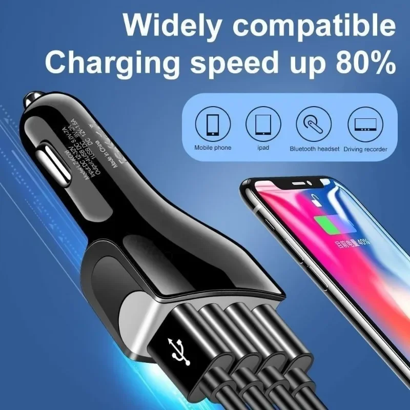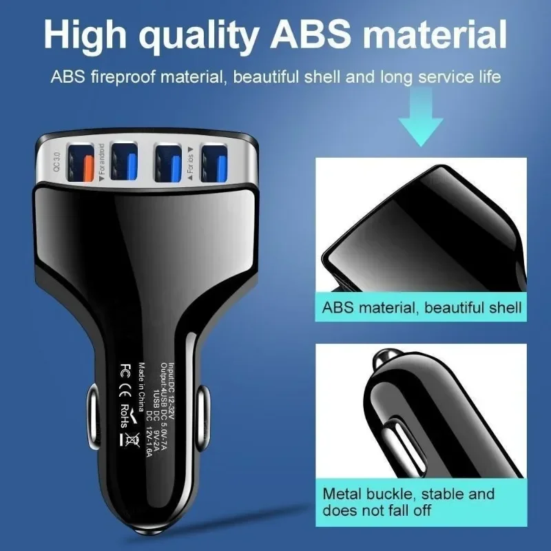 Experience fast, reliable charging on the go with this sleek 30W car charger featuring four USB ports, each delivering up to 4A for rapid device power-up. Compatible with Qualcomm Quick Charge 3.0 and operating within a 12-24V/12-32V input range, it seamlessly powers multiple smartphones, tablets, or other devices simultaneously. Its modern, streamlined design in black or white boasts a high-gloss, iridescent finish that shifts shades between black, purple, and blue, highlighting its premium, high-tech aesthetic. Certified by CCC, ROHS, FCC, and CE, this compact, ergonomic charger fits snugly into your car’s lighter socket, ensuring dependable performance wherever your journey takes you.