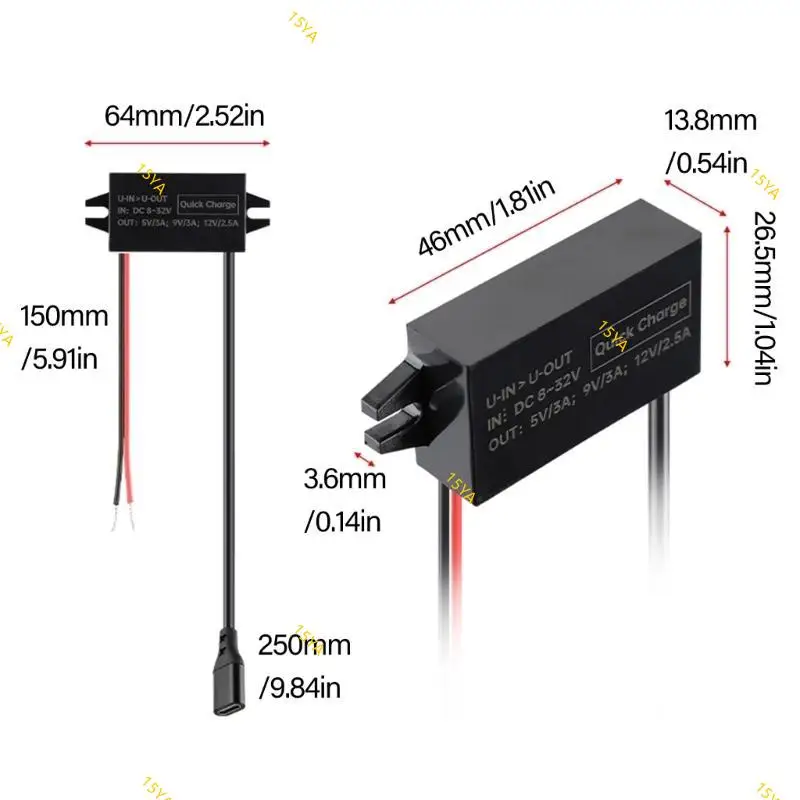 Experience fast, reliable charging with this sleek, black Type C power module designed for automotive use. Its minimalist rectangular shape and smooth matte finish make it unobtrusive yet highly functional. The device features white printed labels that clearly display input and output voltages, emphasizing the technical precision needed in modern vehicle electrical systems. Small enough to fit comfortably in your hand at approximately 46mm by 26.5mm by 13.8mm, it seamlessly integrates into your vehicle or outdoor setup. The insulated red and black wires add a vibrant, practical touch to its utilitarian design. Built to withstand the rigors of travel, this waterproof module provides essential power delivery while maintaining a durable, modern look that blends with any vehicle interior or exterior environment.