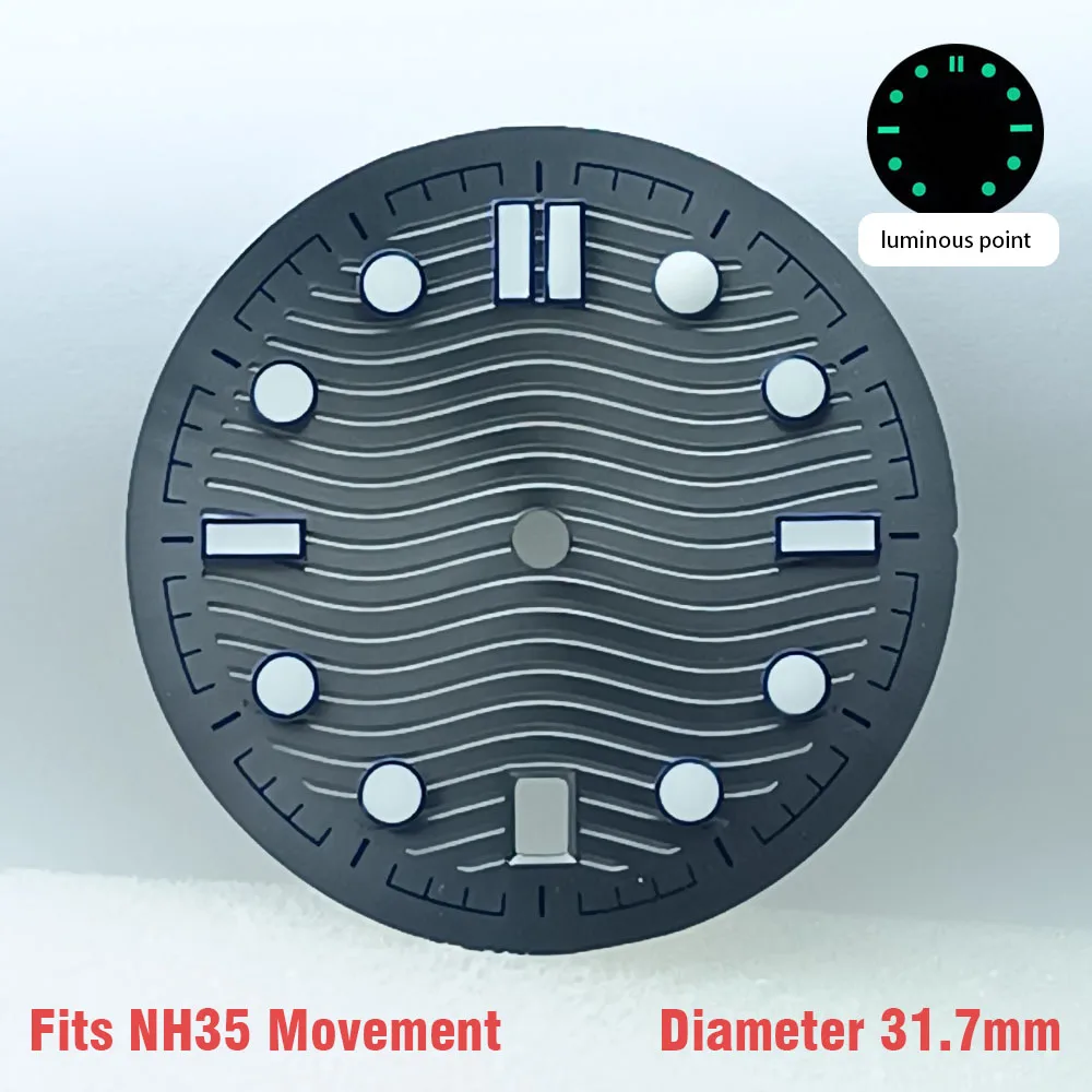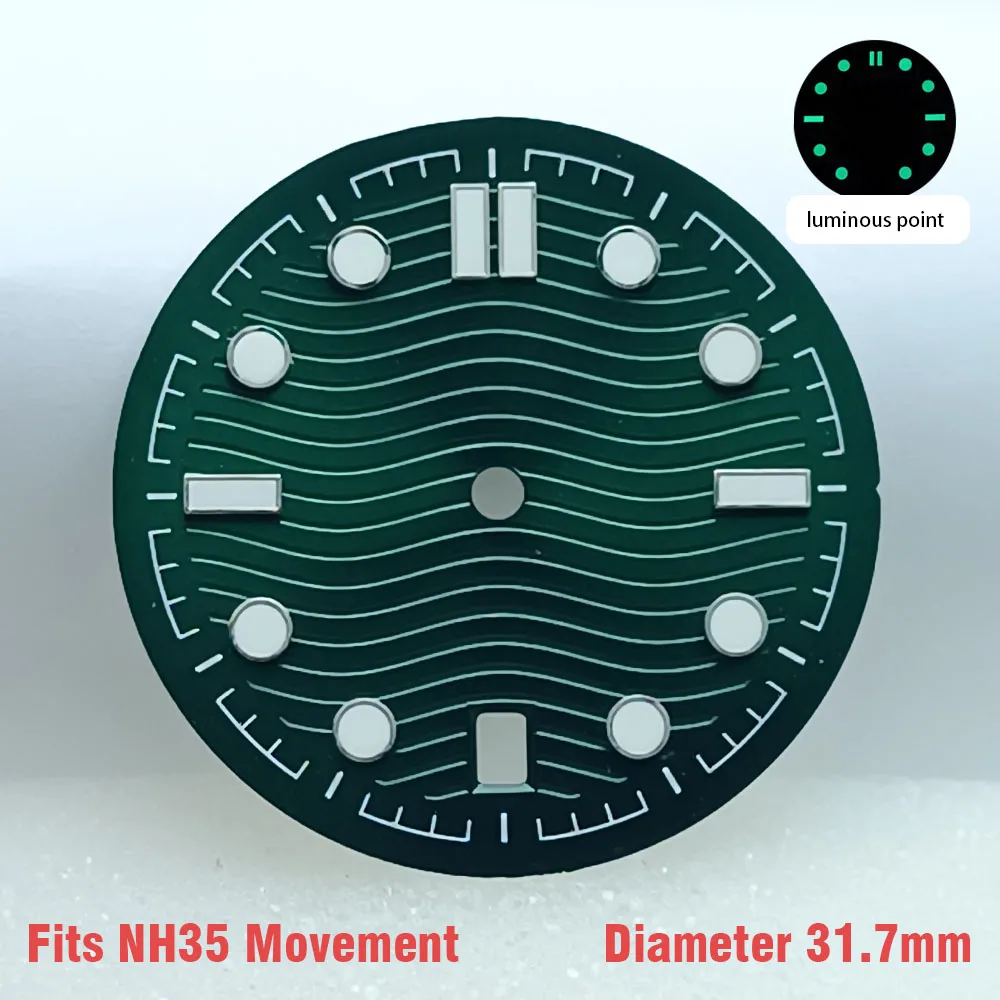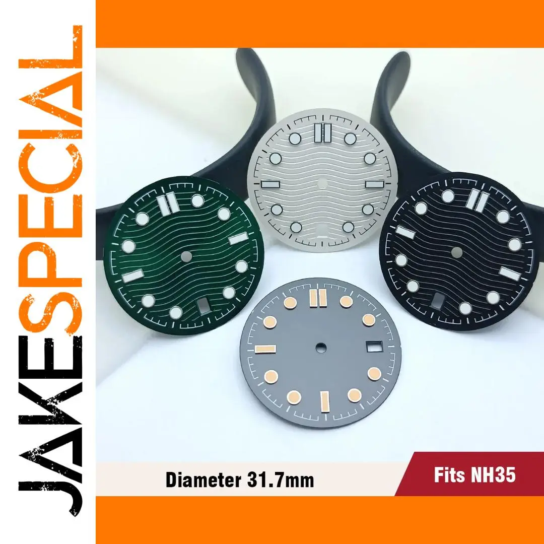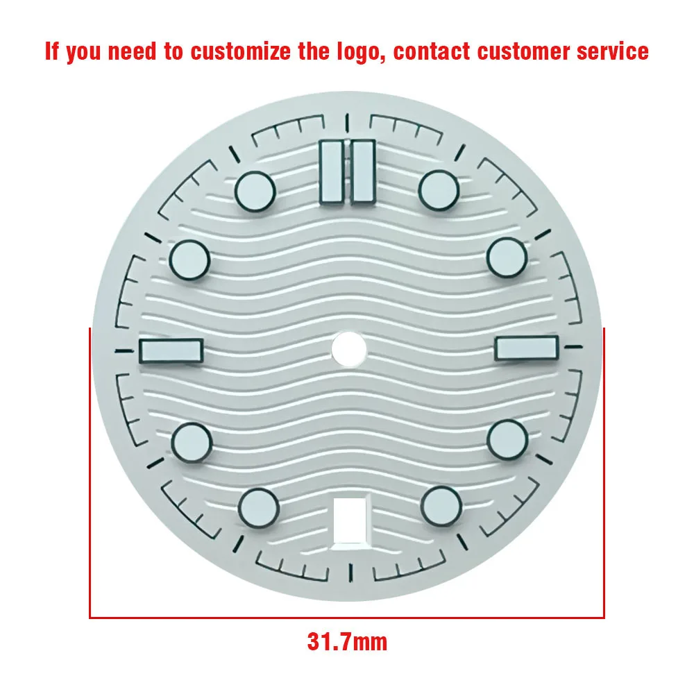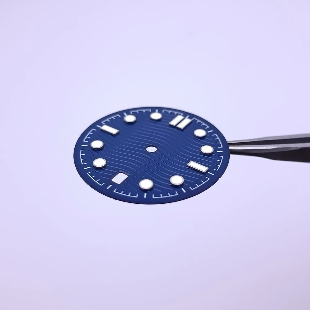 Enhance your watch collection with this 31.7mm dial designed for NH35 and NH36 movements, featuring luminous hands for improved visibility in low light. Crafted from durable alloy, it offers a variety of striking color options including green, black, white, gray, and blue, with hand colors in black, blue, gold, rose gold, and silver. Its dateless design at the 6 o’clock position makes it versatile for custom watch projects. Suitable for watch enthusiasts seeking a high-quality, reliable dial, this piece combines textured, wavy surface patterns with luminous accents, providing a sophisticated and dynamic look that will elevate your timepiece’s aesthetic.