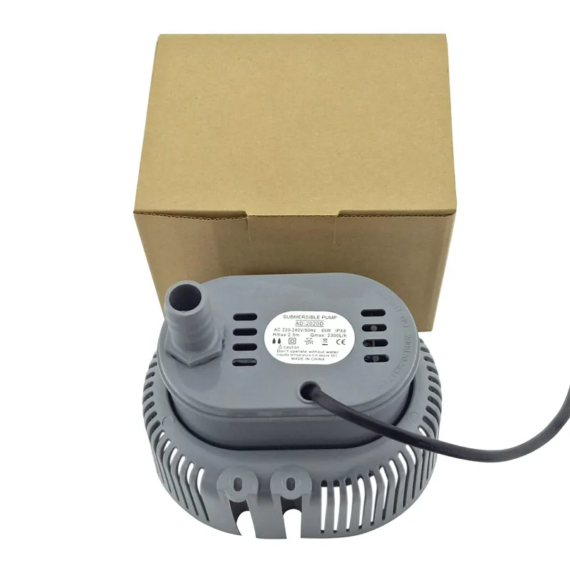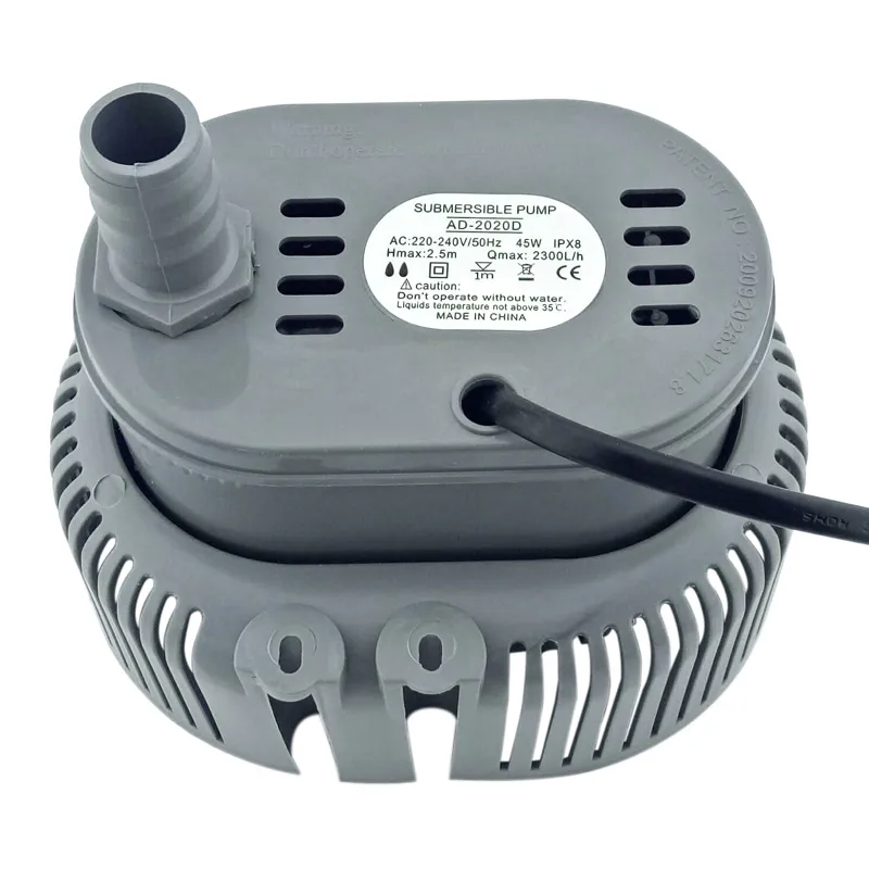 The AD-2020D and AD-2020D PLUS submersible electric pumps are durable, sleek devices designed for efficient water circulation in environmental protection and air conditioning systems. Operating at 380V with 70W power or 220V with 45W, these electromagnetic pumps feature a compact, rounded profile with a matte gray plastic surface for enhanced durability. The pumps have a tapered cylindrical inlet/outlet port, ventilation slots on the top for heat dissipation, and small mounting protrusions for secure installation. Certified with CE, they are ideal for low-pressure water applications, providing reliable performance for demanding water circulation tasks in adult-use environments.
