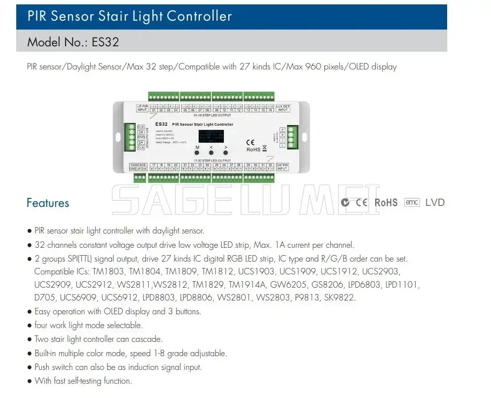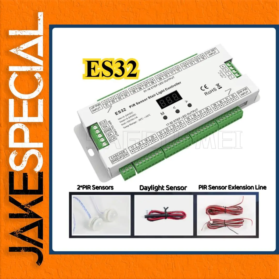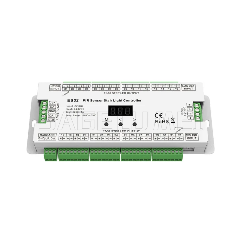 The ES32 PIR Sensor Stair Light Controller is a versatile 32-channel PIR infrared sensor switch designed for low voltage LED light belts, operating within a voltage range of 5-24V and a maximum wattage of 768W. This compact device features a sleek white casing with multiple green terminal blocks for easy electrical connections, while the digital display at the center shows operational parameters. Clearly labeled inputs and outputs facilitate seamless integration with PIR sensors and LED lights, making it ideal for any motion detection application. Whether enhancing stair lighting or creating smart lighting solutions, the ES32 blends functionality and modern design effortlessly.