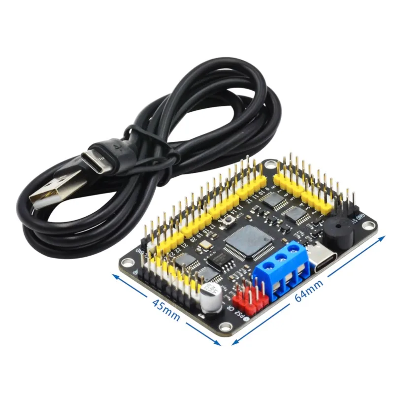 Experience precise control with this advanced 32-channel robot servo control board, featuring a sleek black design and a broad voltage range of 4.2V to 7.2V suitable for servo motors from 9g to 55g. Operating at 5V with a 3.3V CPU voltage, it supports USB communication at 115200 baud and Bluetooth/UART at 9600 baud, ensuring fast data transfer. Equipped with 16MB flash storage and indicators for CPU power, servo status, and PS2 wireless mode, this module offers versatile control options including USB, UART, offline, and PS2 wireless modes. Perfect for robotics and automation projects, it comes with a USB cable for easy setup.