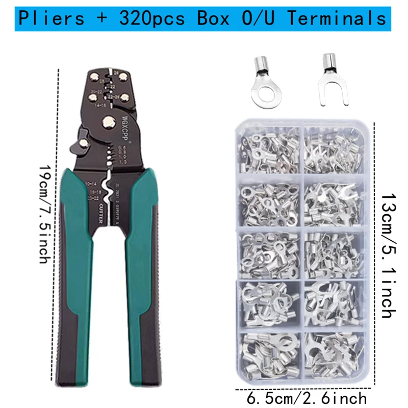 Transform your electrical projects with this comprehensive set of 320 U/O-shaped crimp terminals, perfect for reliable wire termination. Crafted for durability and precision, these shiny silver connectors fit various wire sizes, ensuring a secure connection every time. The set includes an option to add high-quality cable termination pliers, designed with an ergonomic black-and-teal handle and multiple notches for versatile crimping and stripping tasks. Ideal for electrical work, repairs, or custom wiring projects, this organizer-friendly set guarantees neatness and efficiency. Whether you’re a professional or enthusiast, you’ll appreciate the tool’s precise design and the ample quantity of high-grade connectors for long-term use. Enjoy organized, professional results with ease and confidence.