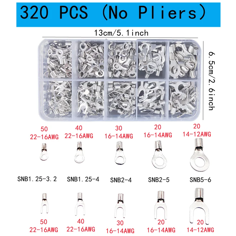- This set contains 320 silver U/O-shaped crimp terminals, suitable for various wire sizes, offering excellent conductivity and secure wire termination for electrical applications.