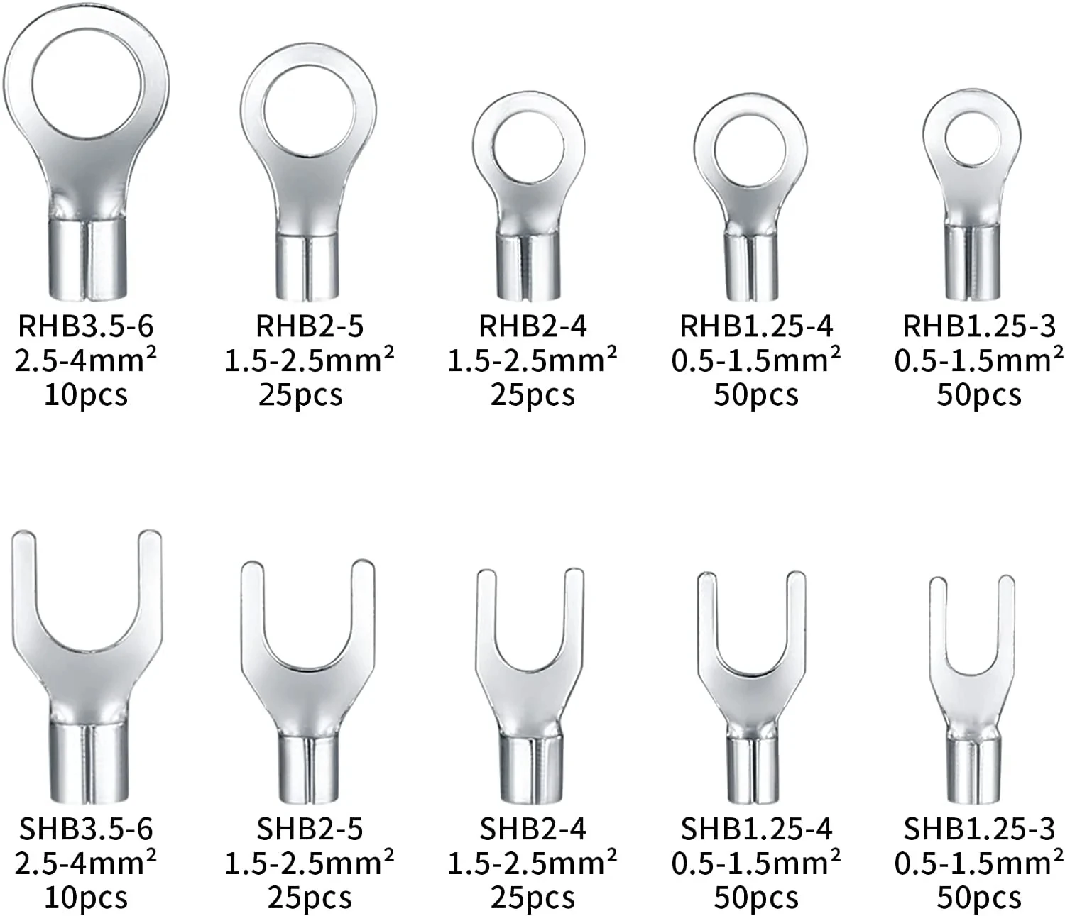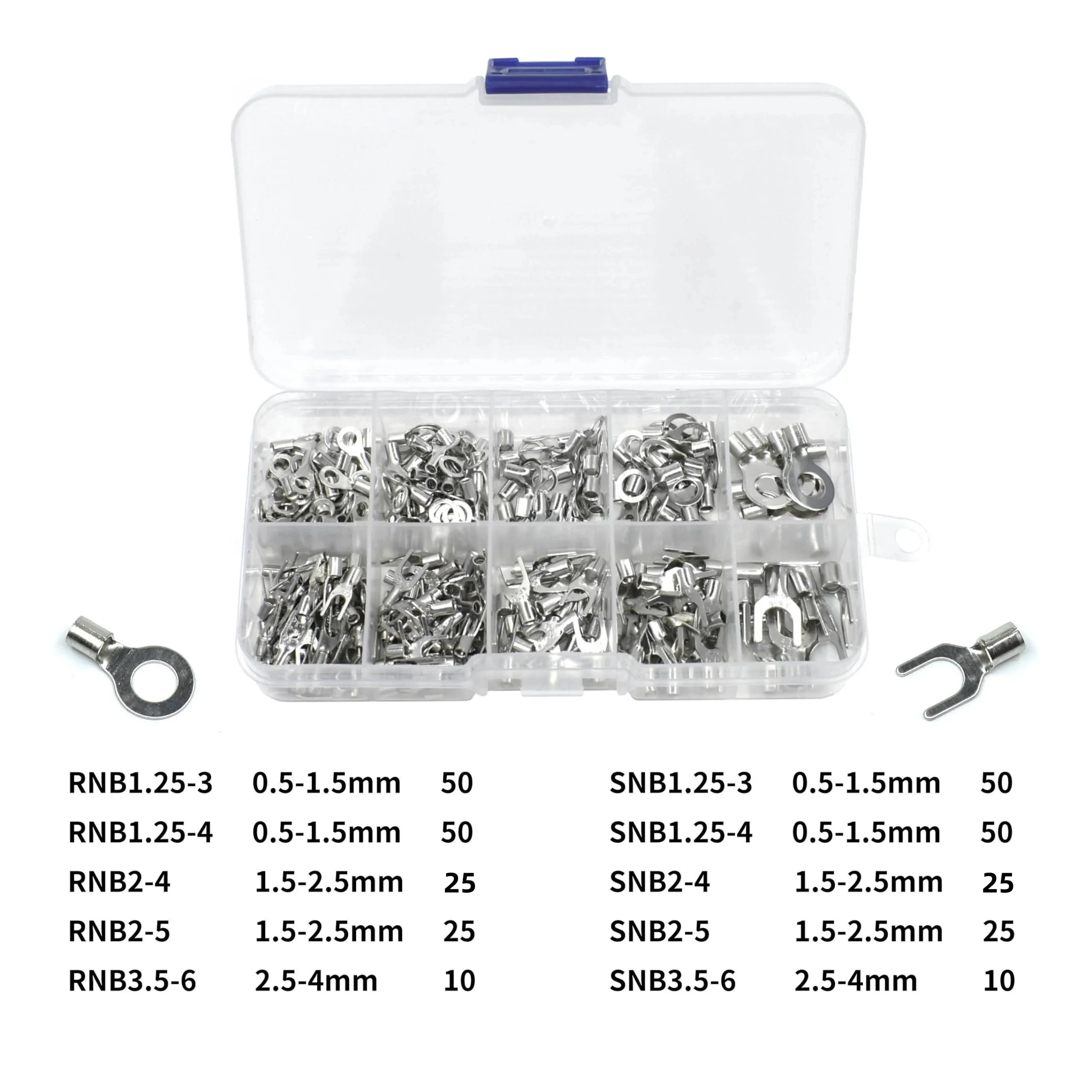 - Includes 10 types with specifications: 50 pcs RNB1.25-3 (22-16AWG, M3), 50 pcs RNB1.25-4 (22-16AWG, M4), 25 pcs RNB2-4 (16-14AWG, M4), 25 pcs RNB2-5 (16-14AWG, M5), 10 pcs RNB3.5-6 (14-12AWG, M6); compatible with a wide range of projects.