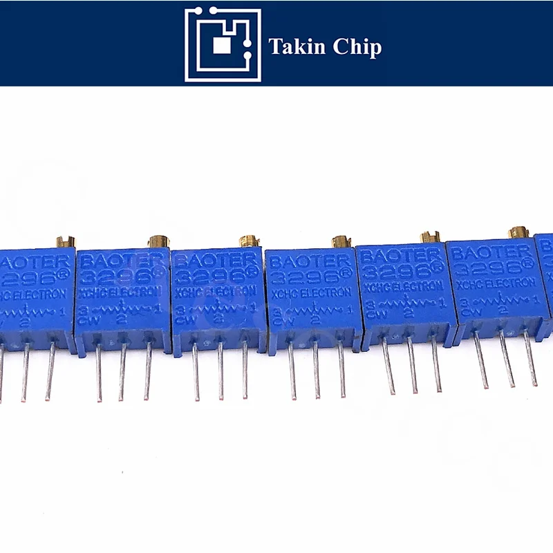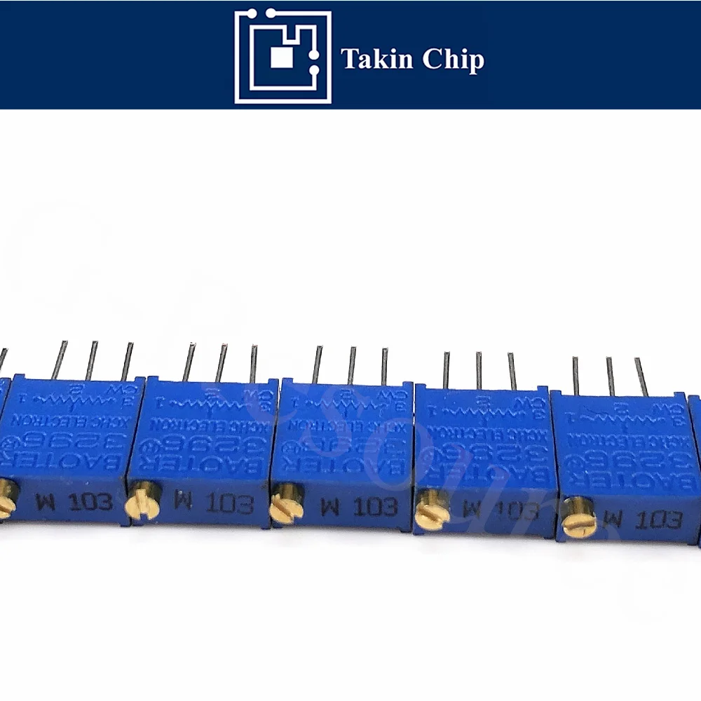 Enhance your electronic projects with this set of 10 precision trimmer potentiometers, featuring model numbers 3296W-1-103LF and 3296W-1-503, with resistance values of 10K ohms and 50K ohms respectively. Designed in a sleek DIP package, these new, high-quality components allow for accurate resistance adjustments. The compact rectangular blue design is accentuated by crisp white markings for clear identification and a subtle gold adjustment screw on top for precise tuning. With durable metallic pins for reliable soldering, these potentiometers are ideal for technical applications requiring fine resistance control, ensuring seamless integration and optimal performance in your circuit designs.