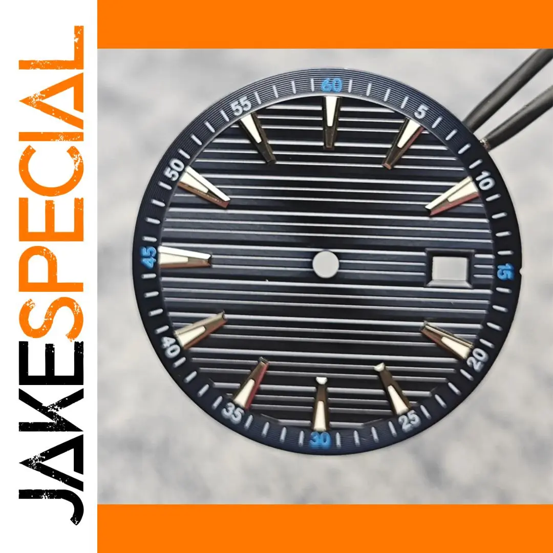 Elevate your style with this sophisticated 33.5mm Black Sports Watch Dial, expertly crafted to fit NH35/NH36 movements. The dial showcases a unique textured surface with striking horizontal lines, offering both durability and a modern aesthetic. Its captivating design includes alternating hour markers in metallic tones and bold blue numbers, ensuring easy readability at a glance. The highlight of this dial is its square cutout at the 3 o'clock position, ideal for a date display, adding extra functionality to your watch. Imagine adorning your wrist with this stunning replacement dial, enhancing your collection and making a bold statement in any setting.