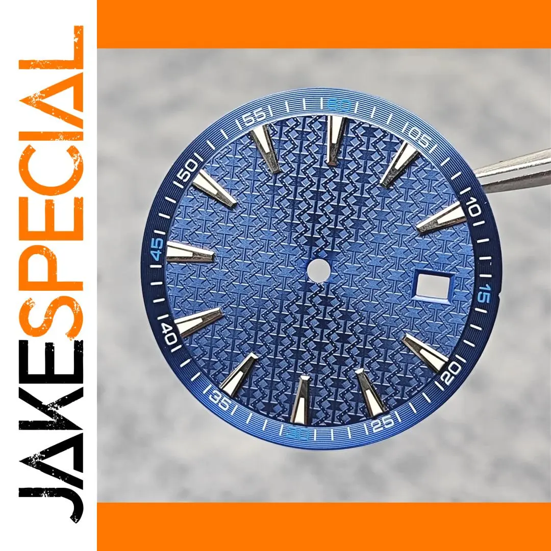 This striking blue watch dial is designed for automatic movements like NH35, NH36, 4R, and 7S, offering the perfect upgrade for your timepiece. The dial features a textured gradient of blue shades, creating a captivating depth. Its silver-tone triangular hour markers, with certain positions emphasized, gleam beautifully against the blue background. Minute markers encircle the outer edge, ensuring precision. A small square cut-out adds functionality, potentially serving as a date display. Completed with a brushed surface, this watch dial is a versatile piece that marries style with practicality, elevating your watch to new heights.