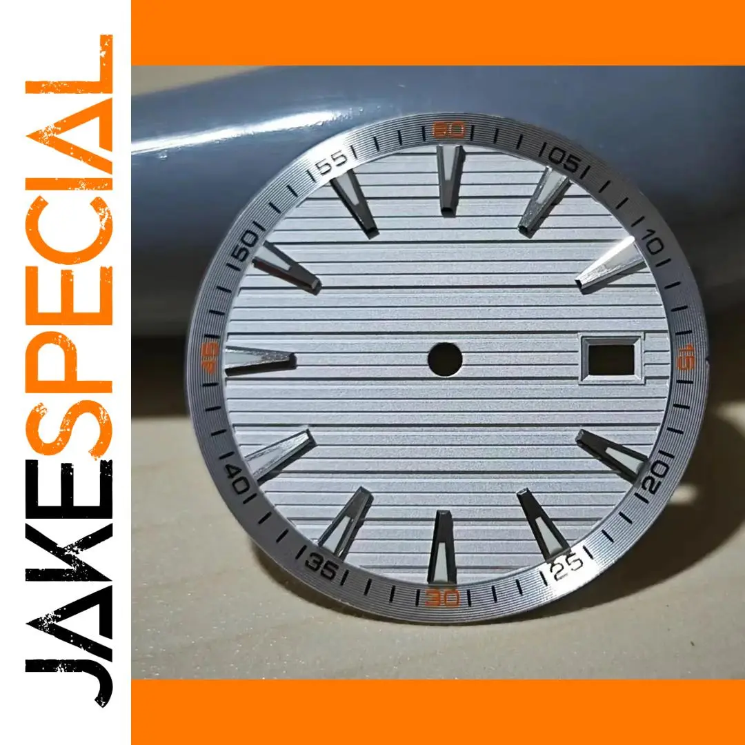 This 33.5mm watch dial is an exquisite piece designed for those who appreciate fine craftsmanship and elegant design. Featuring a textured silver finish with eye-catching horizontal grooves, it ensures a modern look for your timepiece. The dial includes elongated metallic hour markers and black minute markers, with distinctive orange accents to make essential readings stand out. A date window is thoughtfully positioned for convenience, while the polished outer rim enhances its overall aesthetic appeal. Perfectly compatible with NH35/NH36/4R/7S movement, this watch dial serves as an ideal replacement piece for your project, allowing you to create or restore a timepiece that reflects your personal style.