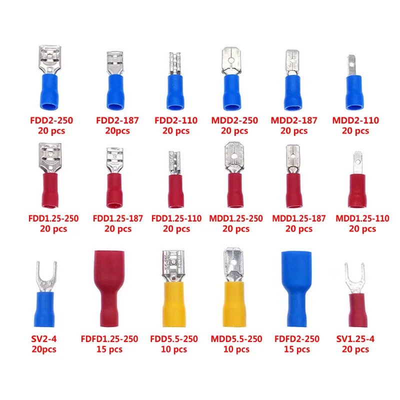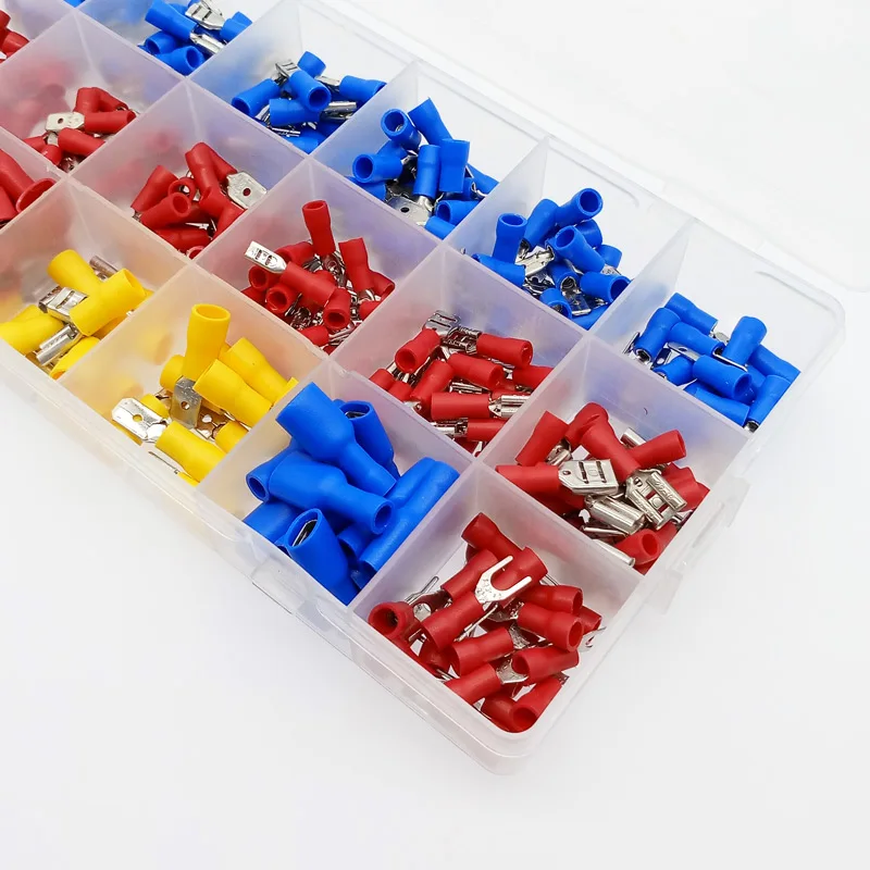 Organize your electrical projects with this comprehensive set of 330 assorted full insulated crimp terminal connectors, including U-type, spade, and ring shapes. Crafted for safe and reliable connections, these connectors feature full plastic insulation in vibrant colors like blue, red, yellow, and black, with durable metallic silver crimp sections. Ideal for a wide range of wiring tasks, this customizable kit ensures easy access and tidy storage with its transparent plastic box and compartmentalized design. Perfect for professionals and enthusiasts alike, it provides the essential components needed for secure, insulated electrical connections, combining functionality, safety, and organization in one practical set.