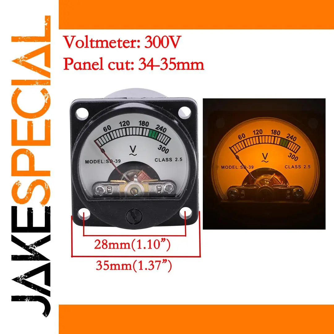 This 34-volt AC analog panel meter measures up to 300V with a 35x35mm black plastic frame and a clear white dial marked from 0 to 300 volts. It features a 28x28mm mounting hole and fits a 33.70mm panel cutout, making installation straightforward. The device includes a 12V warm filament backlight that illuminates the dial with a cozy yellow-orange glow, ensuring easy reading in low-light conditions. Designed for precise and reliable performance, it boasts a sturdy construction suitable for audio equipment and DIY projects, combining functional accuracy with vintage-inspired aesthetic appeal.