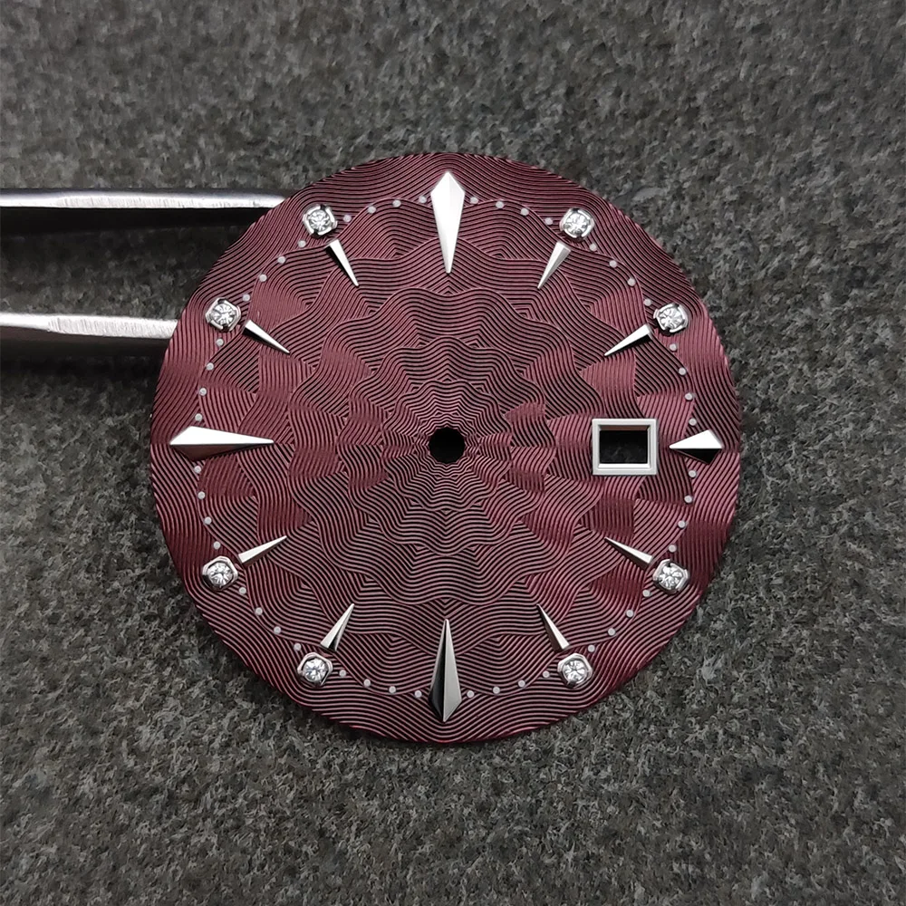 This 35mm stainless steel watch dial is compatible with NH35, NH36, NH4R, and NH38 automatic movements. Designed for men’s fashion and casual wear, it features a sleek round case with a 32mm dial diameter, a numberless display, and intricate textured patterns. Available in vibrant colors such as blue, cyan, green, grey, red, white, and silvery shades, each matching hand style enhances its modern aesthetic. Perfect for replacement or customization, this new, untagged dial seamlessly combines technical precision with stylish design to elevate your watch collection.