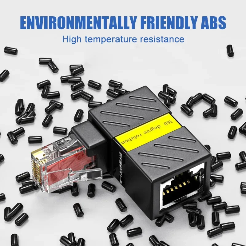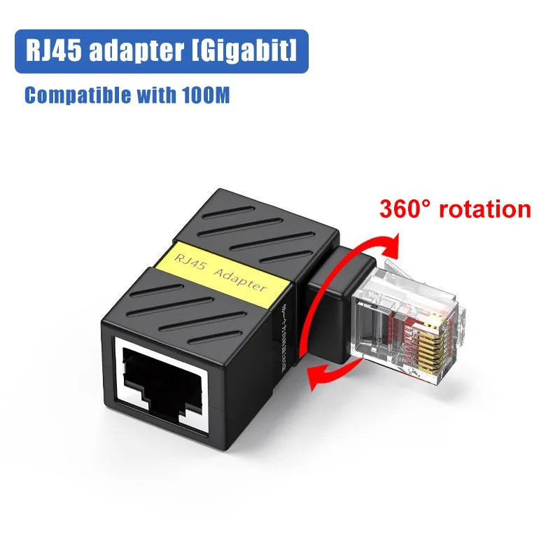 Discover the ultimate flexibility with this this 360° rotatable RJ45 Gigabit network adapter, designed for seamless connectivity in tight spaces. Its sleek black rectangular connector features a sturdy ABS plastic shell with a slightly textured finish, offering both durability and a modern aesthetic. The metal shield on one side enhances electromagnetic interference protection, ensuring stable high-speed connections. The adapter’s full 360-degree rotation, highlighted by a vibrant blue arrow, allows effortless installation and adjustment, making it ideal for complex networking setups. Equipped with gold-plated contacts inside transparent RJ45 connectors, it guarantees reliable data transmission at speeds up to 1000 Mbps and bandwidth of 250 MHz. Compact yet robust, this adapter combines technical precision with ease of use, ideal for professional network deployments.
