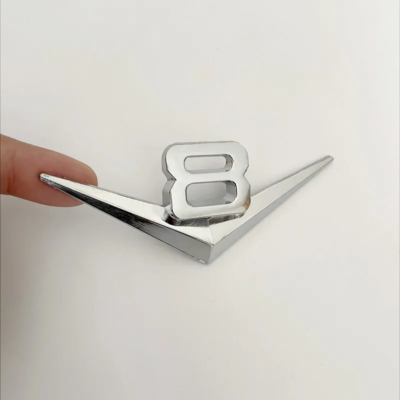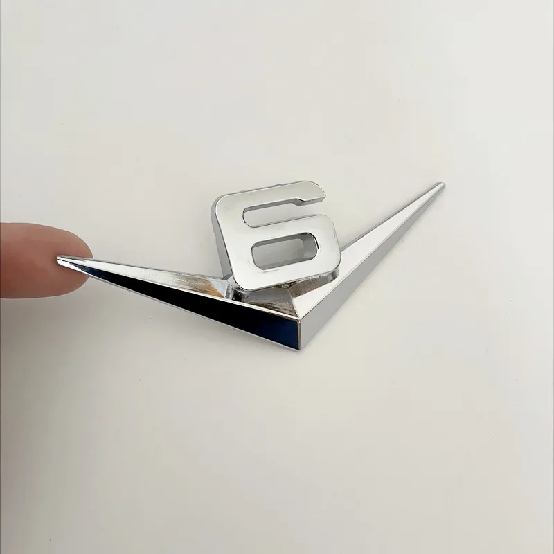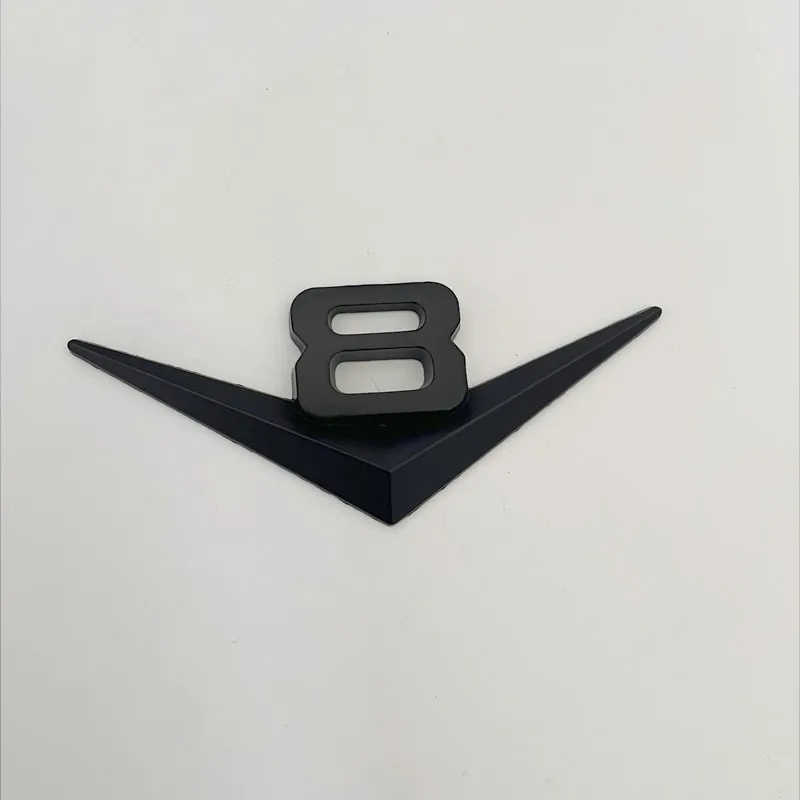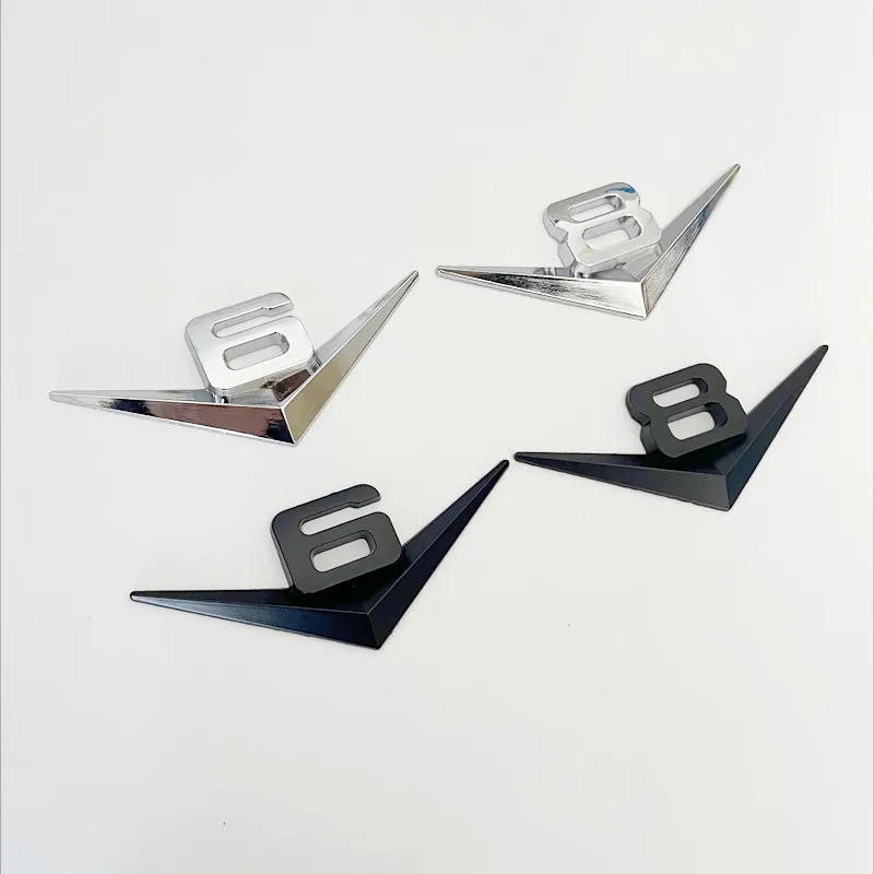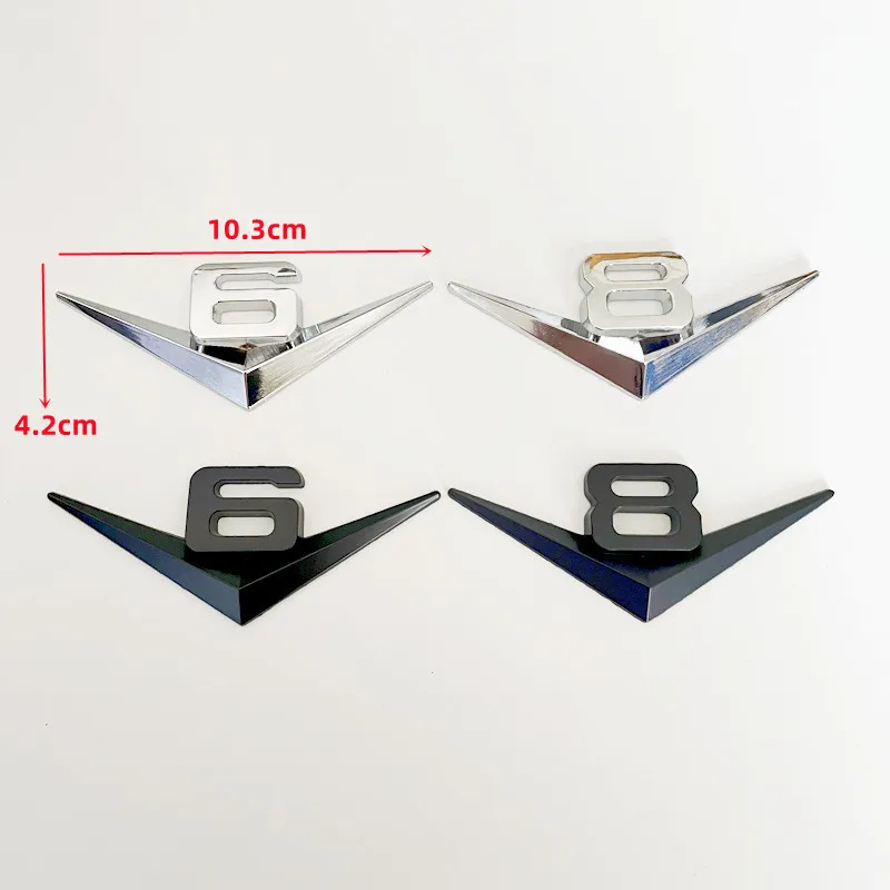Elevate your vehicle's appearance with this striking 3D metal emblem decal, available in stylish V6 and V8 designs. Crafted from durable alloy metal, each emblem boasts a prominent, raised number with sharp, arrow-like extensions that convey a sense of speed and sportiness. The chrome finish provides a high-gloss, reflective appearance, capturing light to enhance its sleek, polished look, while the matte black option offers a modern, understated style. Measuring approximately 10.3 cm in length and 4.2 cm in width, these decals are designed for easy self-adhesive application across the entire vehicle body, perfect for customizing your car’s exterior with a bold statement. Such details highlight your car’s power and personality effortlessly.