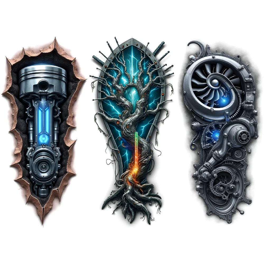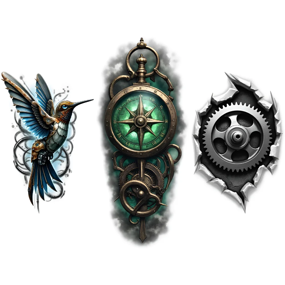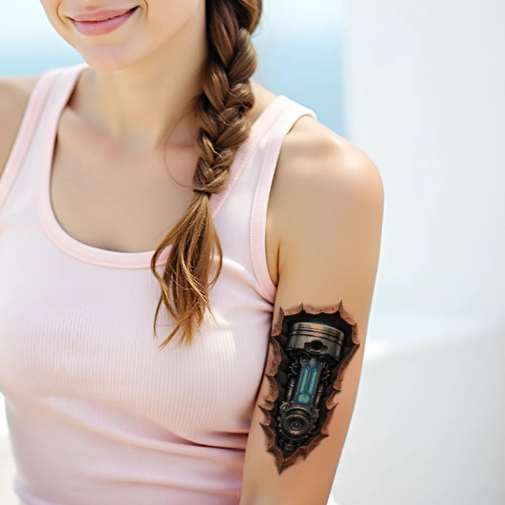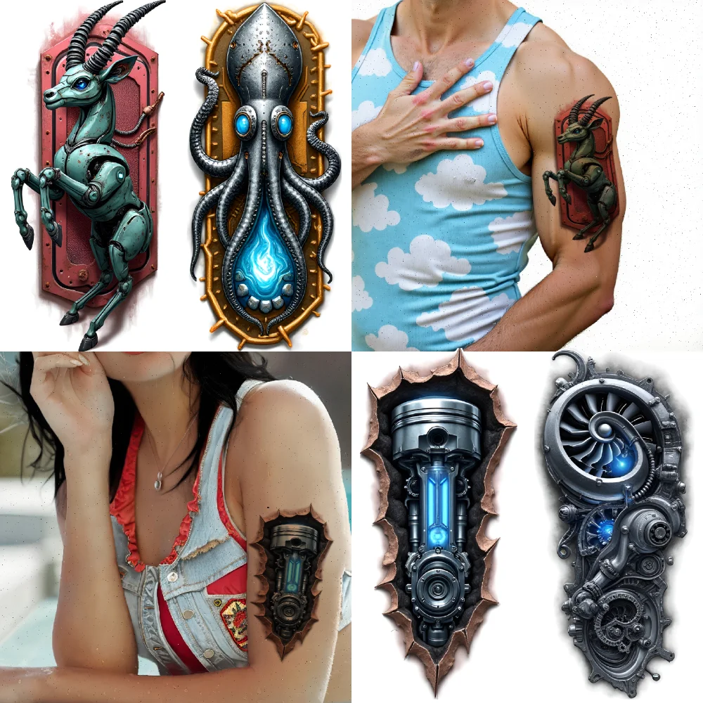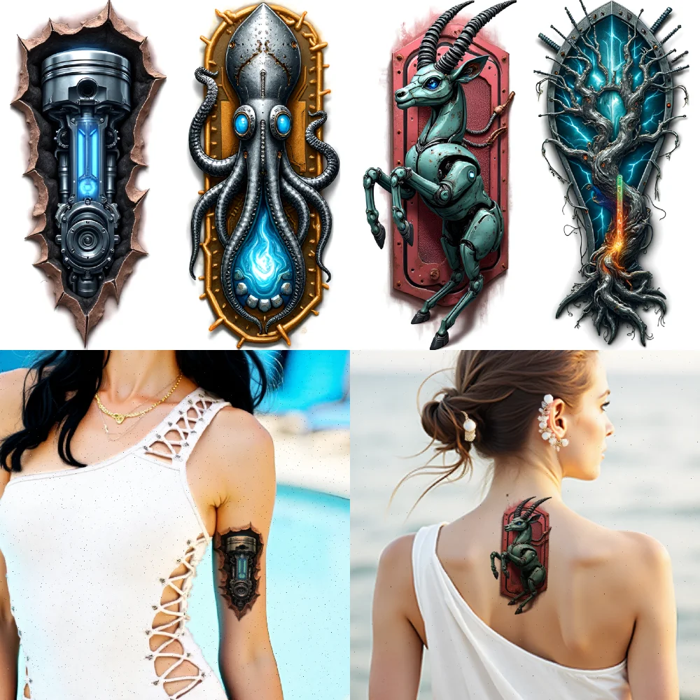 Transform your look instantly with this vivid, photorealistic tattoo set featuring three intricate, high-detail designs. Each tattoo measures approximately 18×9 cm, perfect for arms, legs, or the body to create a striking visual impact. With a futuristic sci-fi and mystical aesthetic, these tattoos showcase metallic gear-like structures, glowing elements, and detailed animal and nature motifs. Crafted for both men and women aged 14 and above, they last 3-7 days, are waterproof, and easily applied within 30 seconds. The designs are perfect for parties, holidays, or any special occasion, giving you a bold and energetic style to express your individuality. These tattoos combine realism with fantastical elements, ensuring you stand out effortlessly.