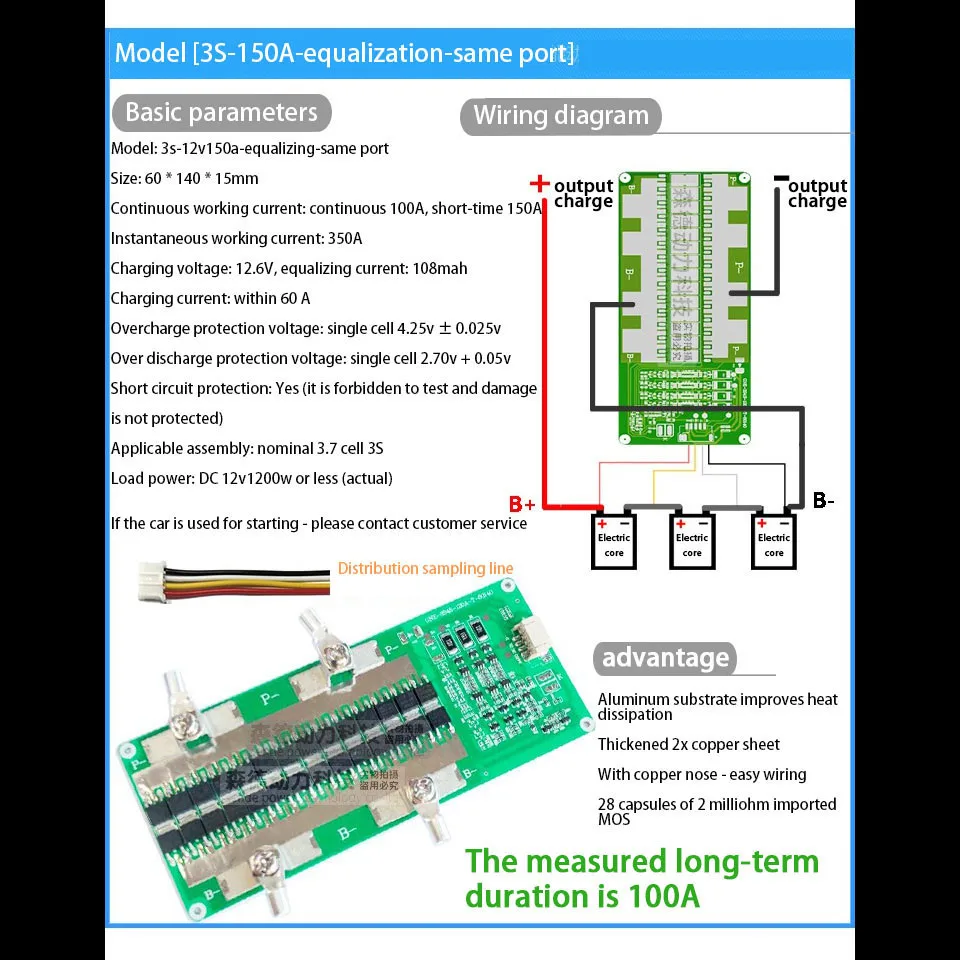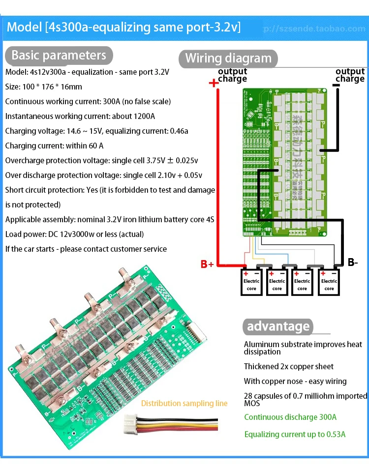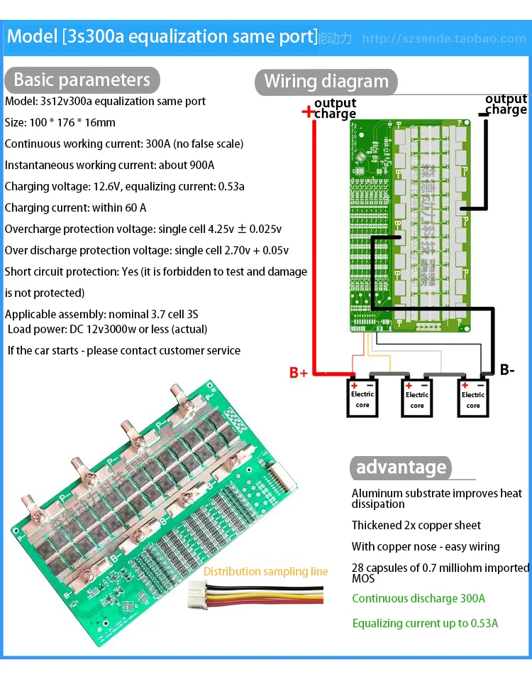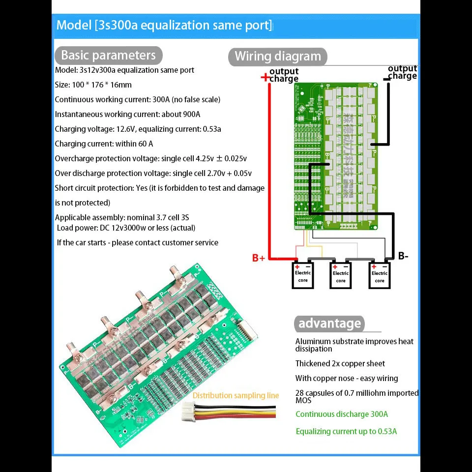 - Technical specifications: Max current 300A, supports various cell configurations, aluminum base for heat dissipation, and comes with a balance cable for easy setup.