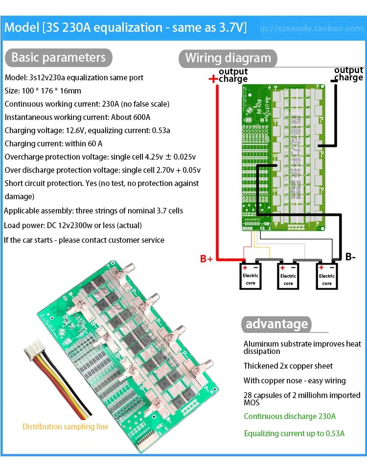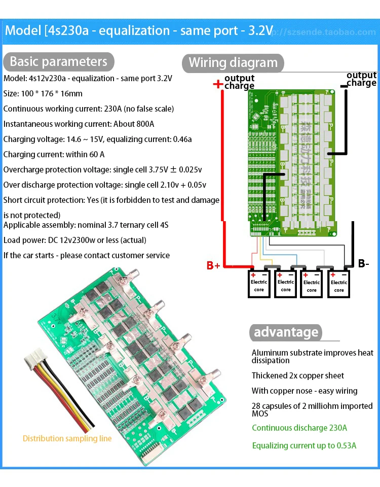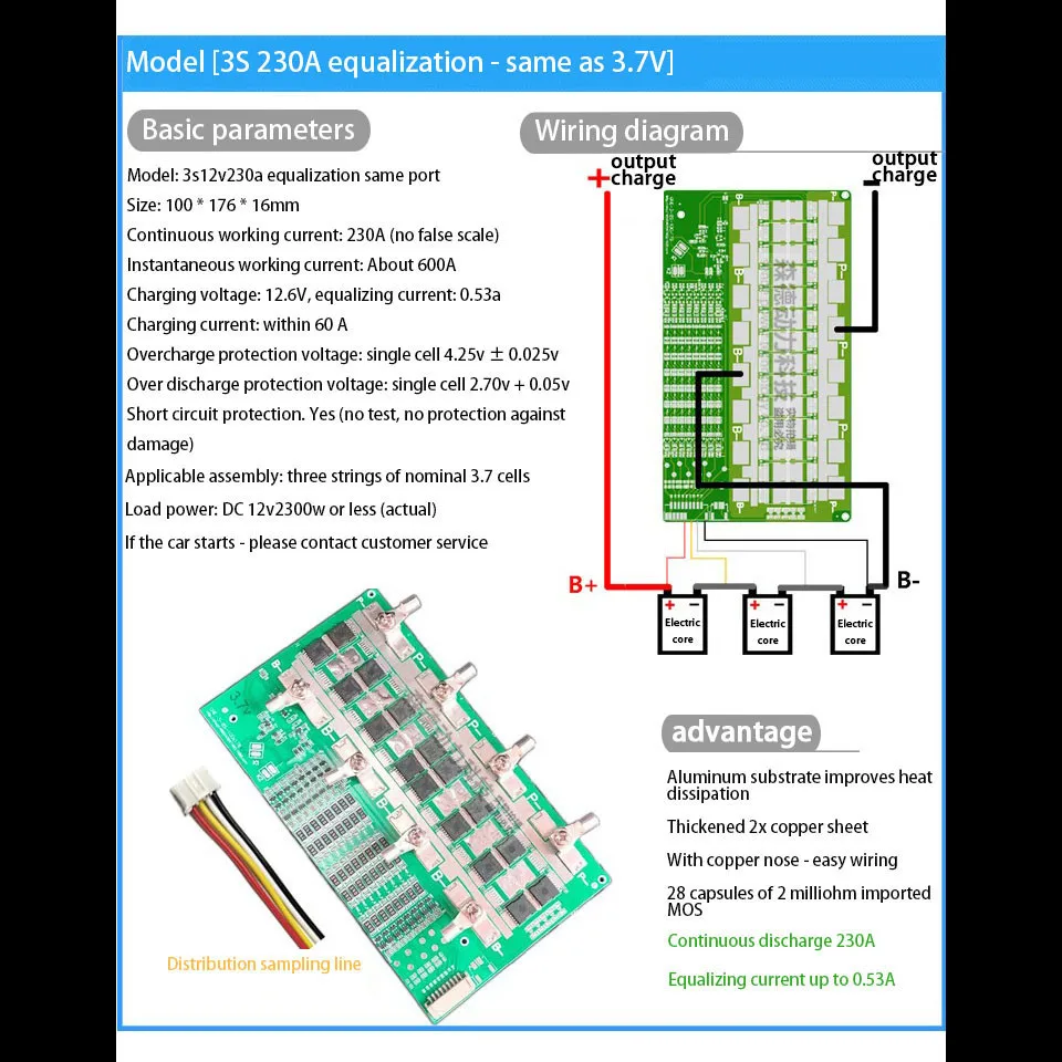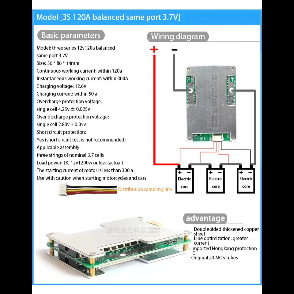 - Technical specifications: Max current 300A, supports various cell configurations, aluminum base for heat dissipation, and comes with a balance cable for easy setup.