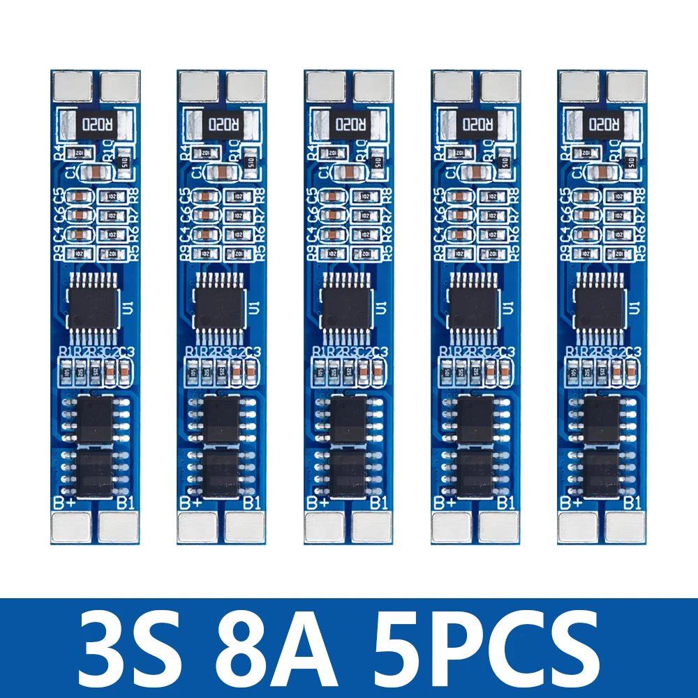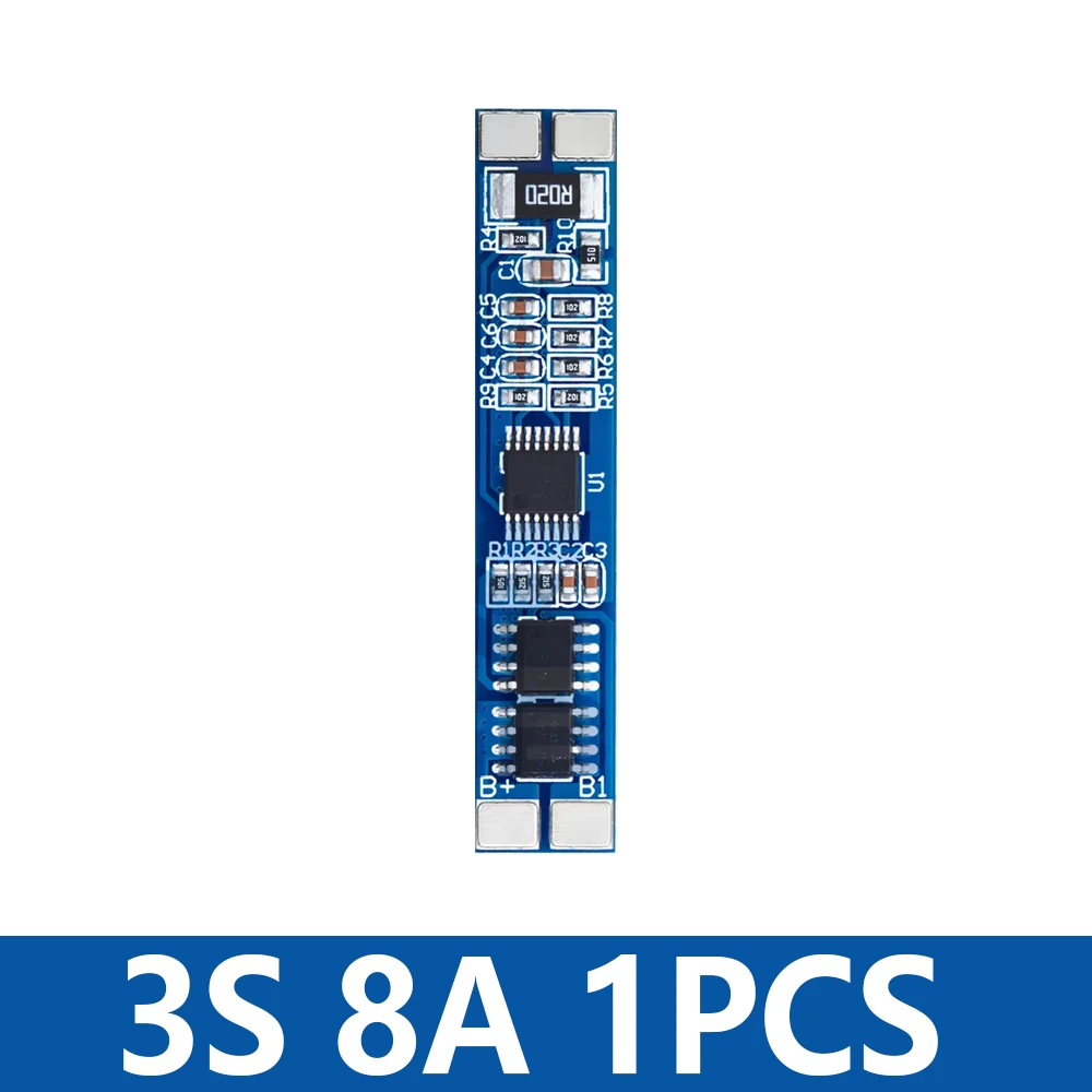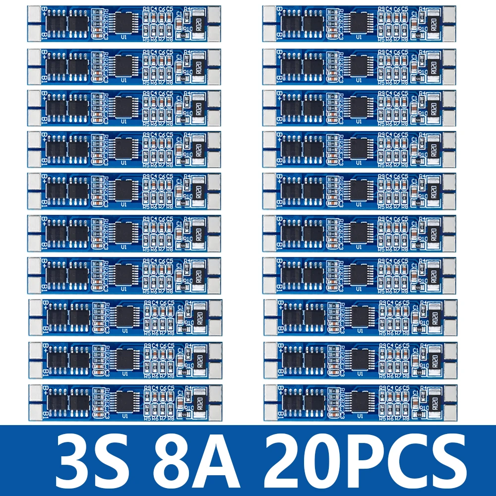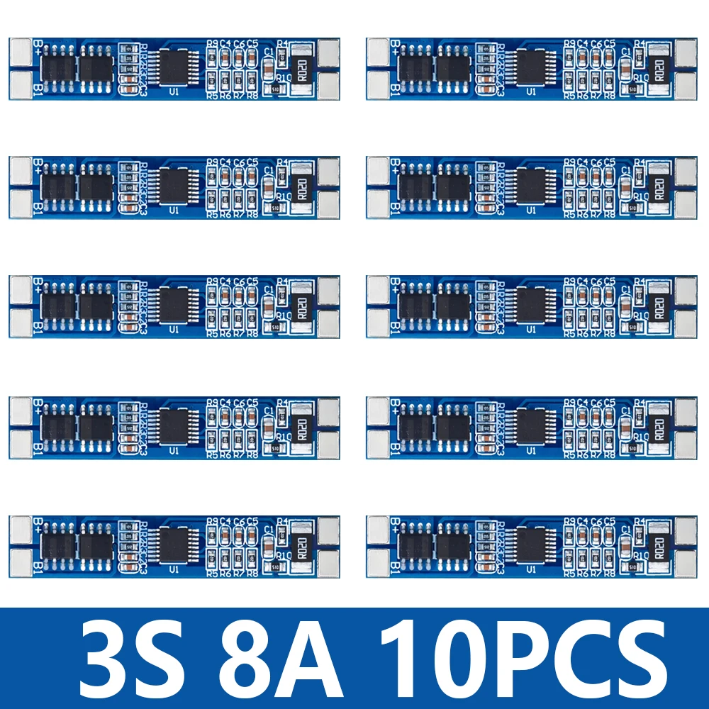 This high-quality 3S lithium-ion battery protection board operates at 12V with an 8A current capacity, supporting a voltage range from 11.1V to 12.6V and a maximum continuous current of 10A. Compatible with 18650 cells, it features advanced logic ICs for efficient battery management and can be customized to fit specific needs. Designed for use as a charger protection component, it performs reliably within a broad temperature range of -40°C to 80°C. Available in packages of 1, 5, 10, or 20 pieces, this sleek, blue PCB ensures precise connection points with clearly marked labels, making it a dependable choice for safeguarding your lithium-ion battery packs.