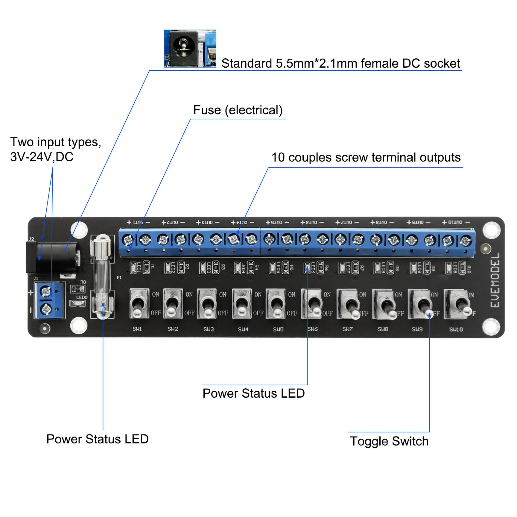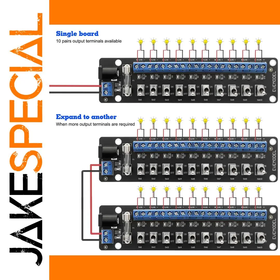 Experience precise power control with this Evemodel 3V-24V DC Power Distribution Module featuring 10 independent channels, each handling up to 1.0A, with a total capacity of 8.0A. Designed for small models and tight spaces, it includes a 2.1mm female DC socket compatible with digital power supplies, screw terminals for flexible wiring, an 8Amp fuse, LED power indicator, and individual toggle switches for each channel. Its sleek, industrial aesthetic with vividly colored components ensures both functionality and modern style, making it the perfect choice for efficient lighting and device management in compact projects.
