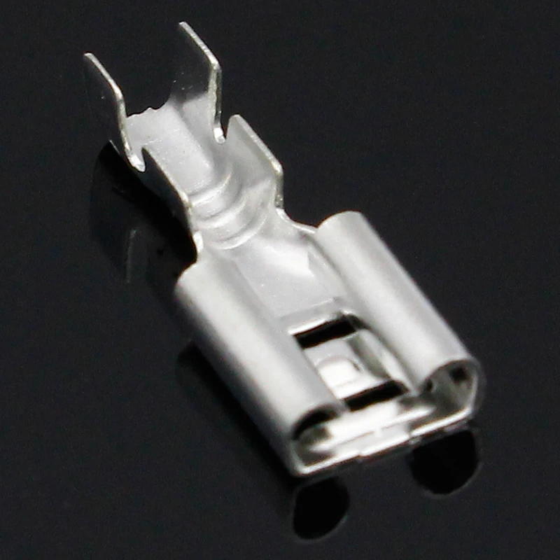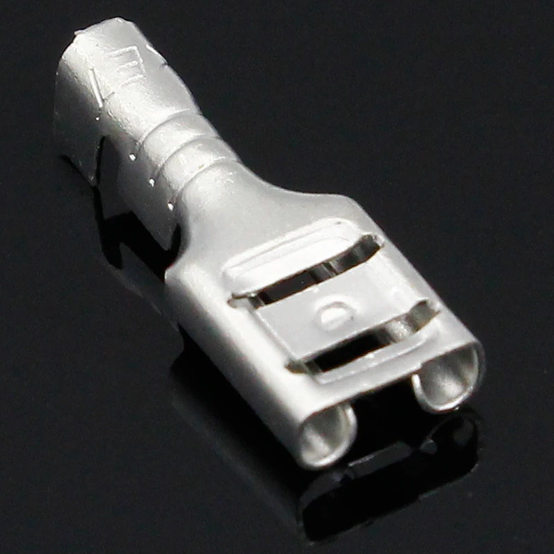 - Compact, rectangular metal parts with outward-curving prongs for easy sliding onto male spade terminals, ensuring quick installation and reliable contact.