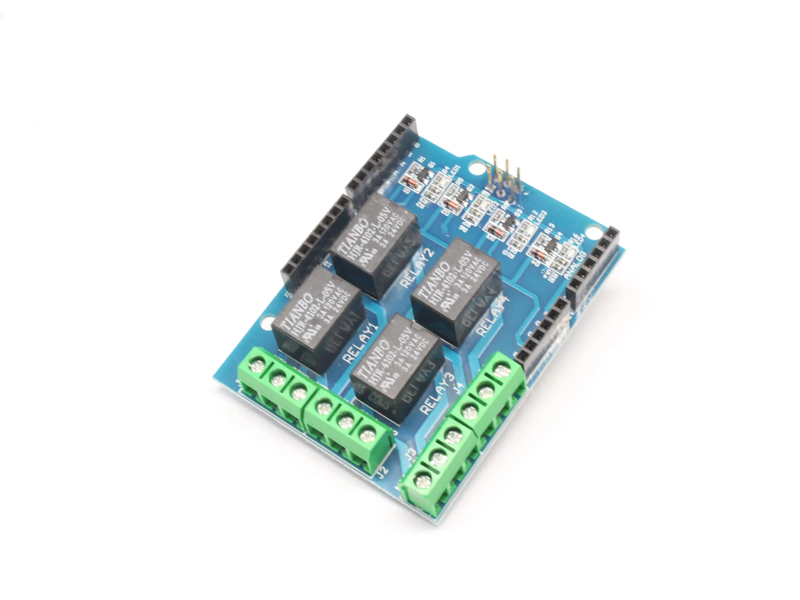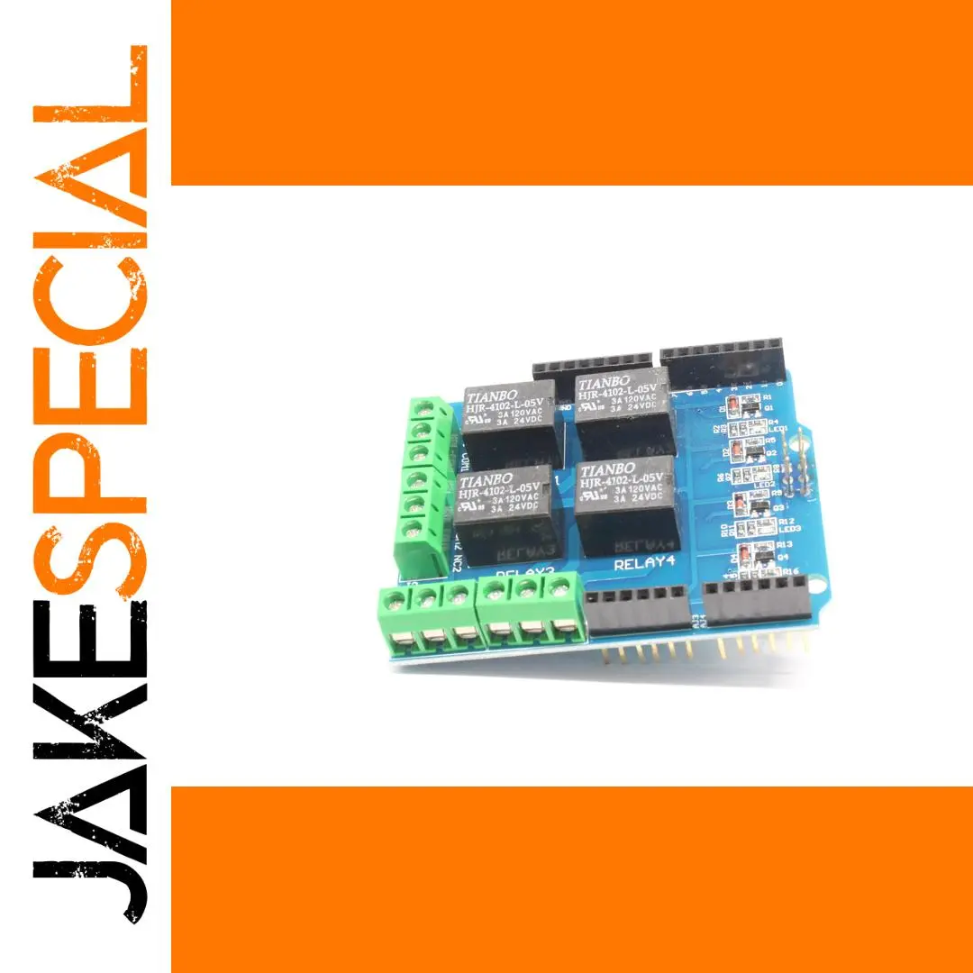 - The four black relays, marked HJR-4102-L-5V, switch high-voltage loads with control signals at 5V DC, ideal for controlling appliances, motors, or other high-power devices.