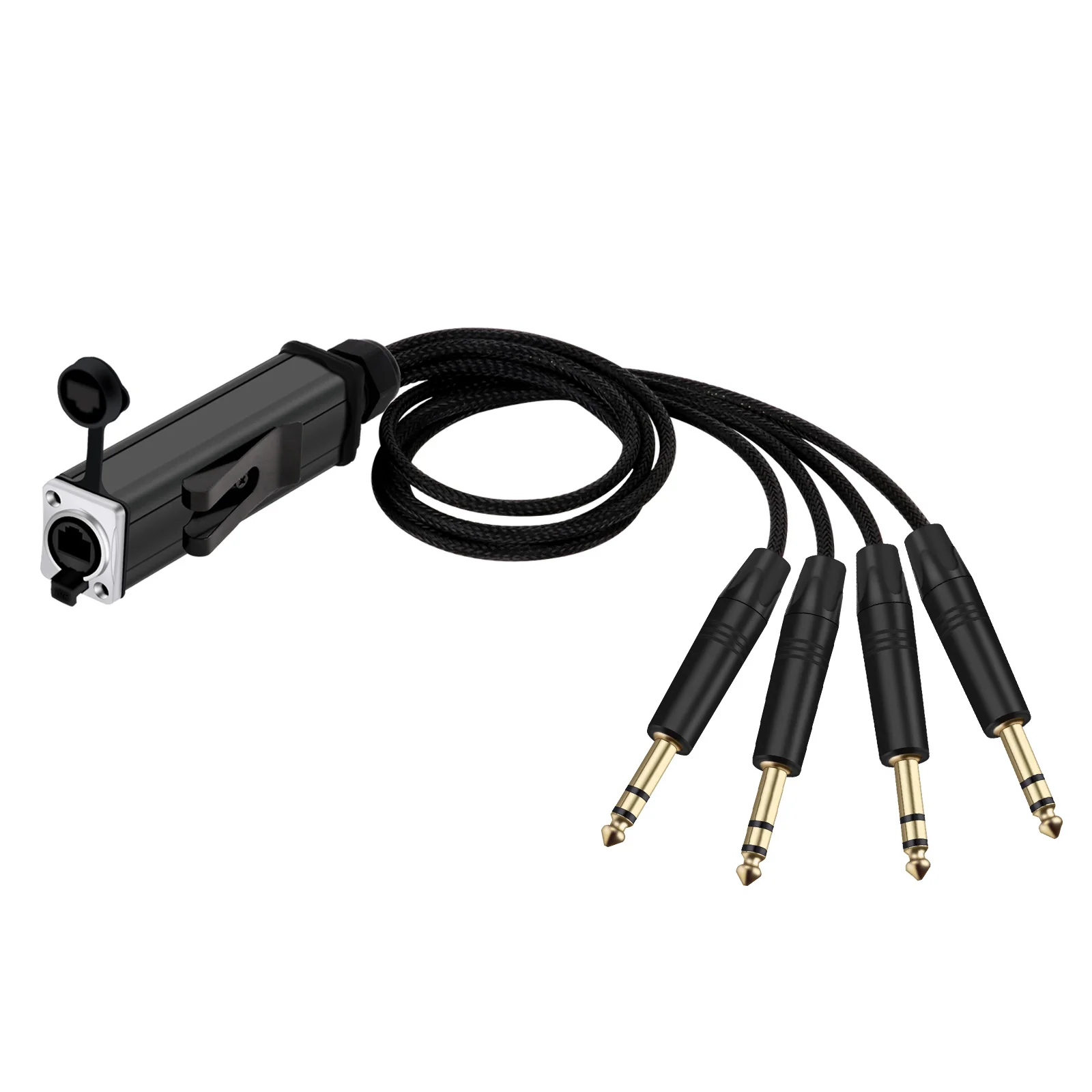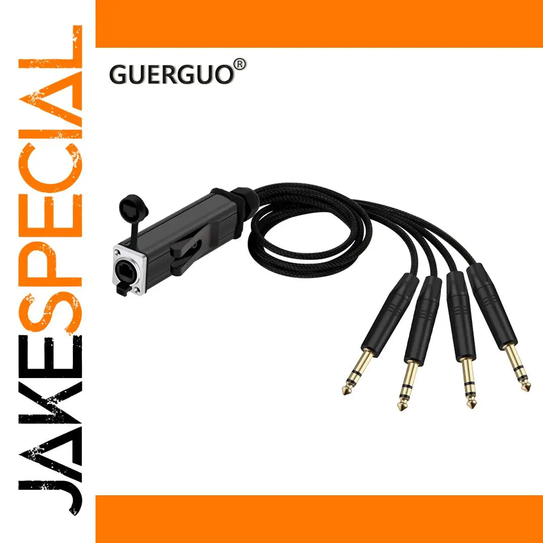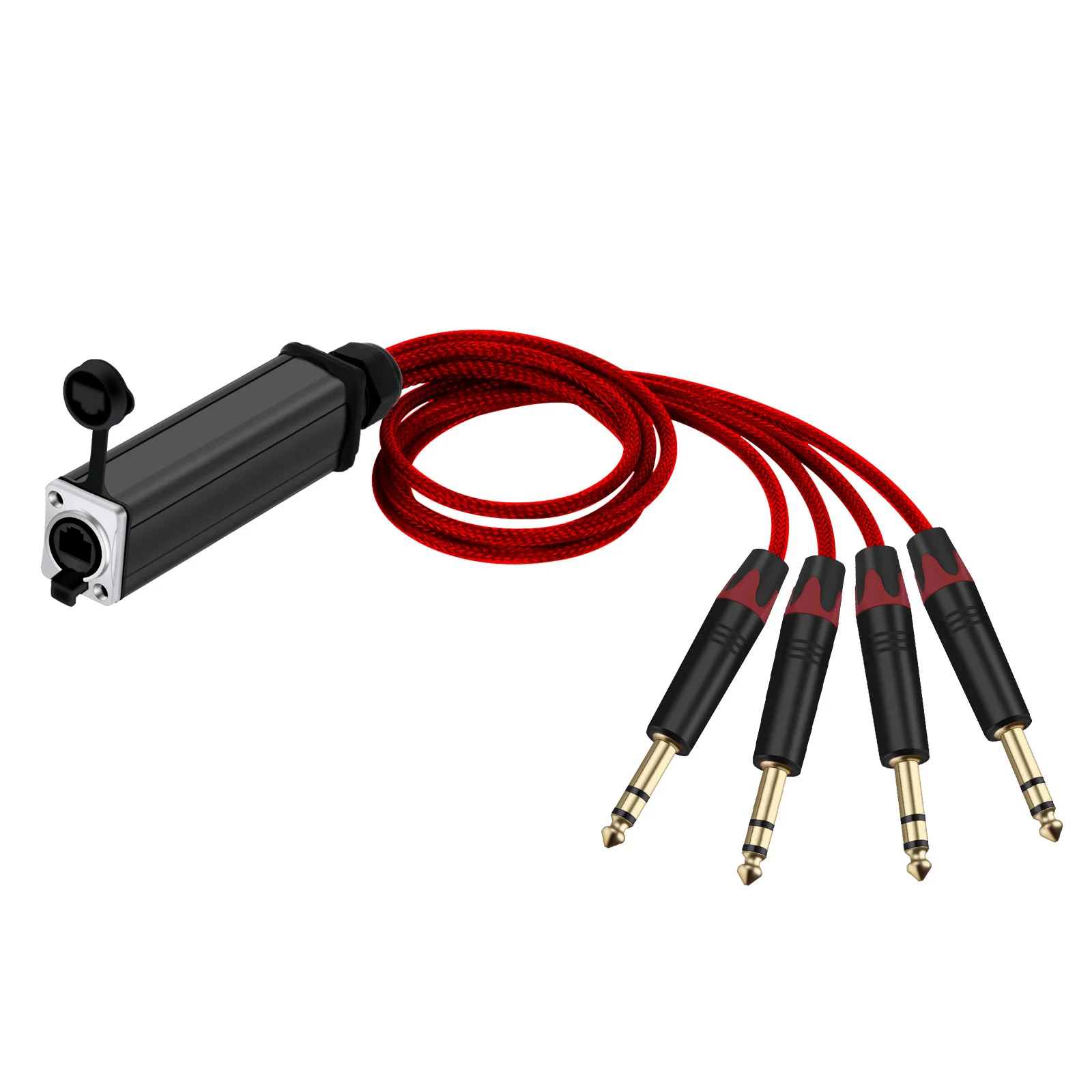 Experience professional-grade sound transmission with this versatile 4-channel audio snake cable, available in lengths from 0.5 meters to 10 meters. Crafted with 24 AWG oxygen-free copper conductors and a 98% braided shield for superior interference rejection, it transmits four balanced analog, AES, or DMX signals through shielded Ethernet (Cat5) cable. The rugged, waterproof RJ-45 female connectors and 6.35mm stereo jacks feature black and red color coding for organized setup, while the 4mm diameter cable ensures durability and flexibility for indoor and outdoor applications. Ideal for microphones, instruments, mixers, and multimedia equipment, delivering clear, high-quality, interference-free audio performance.