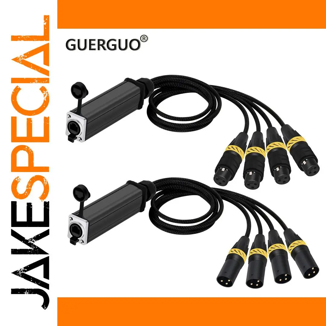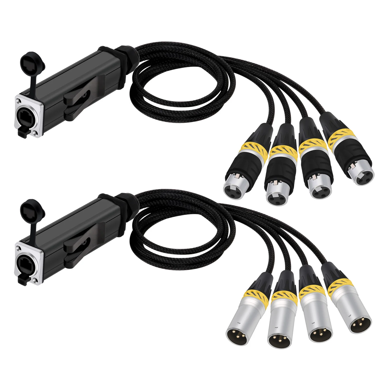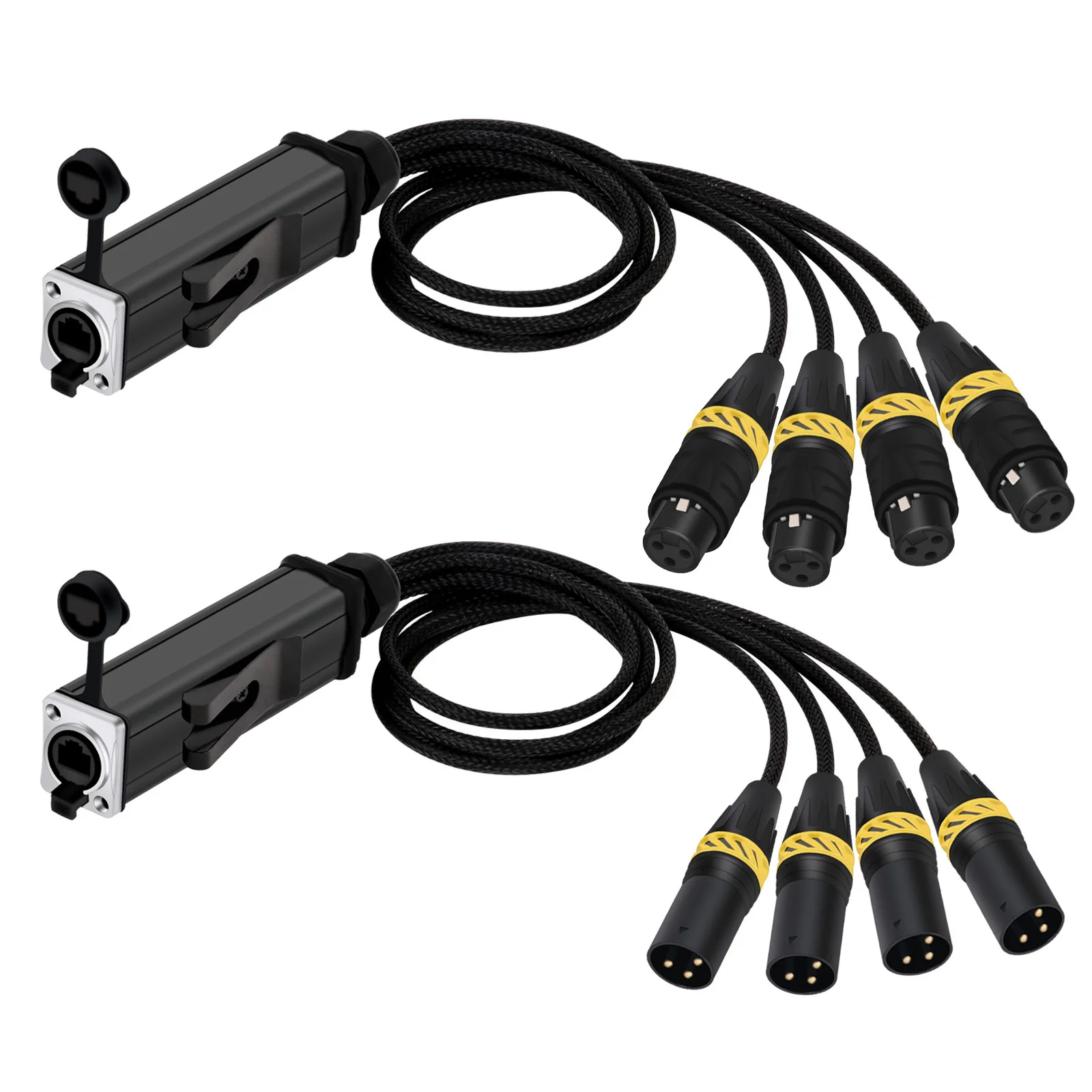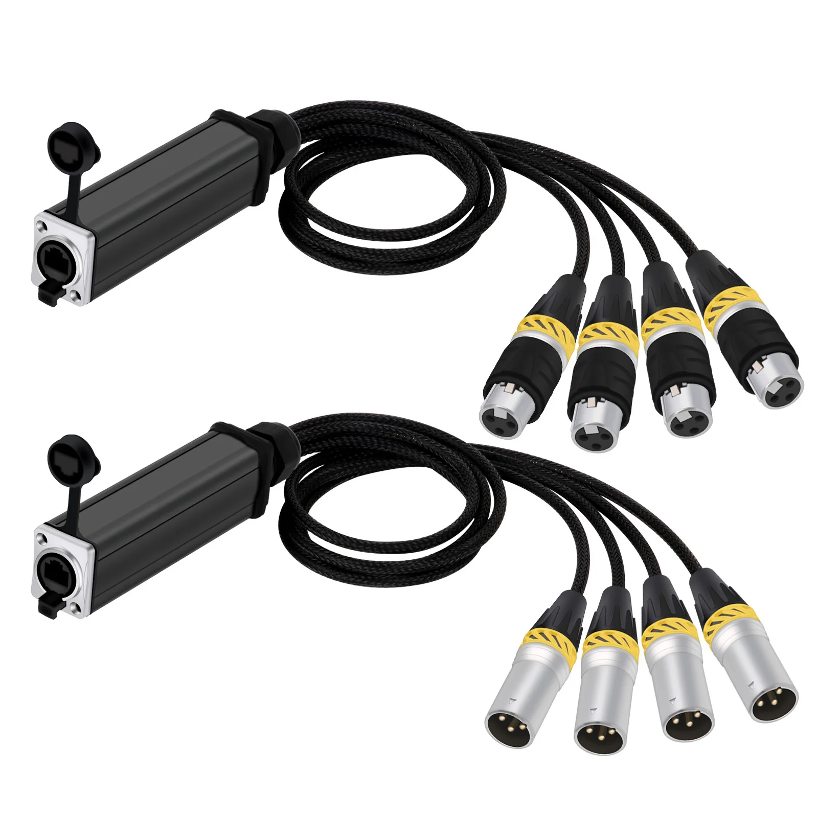 Experience seamless, high-quality audio transmission with this durable, professional-grade 4-channel XLR extender set. Designed for audio engineers and stage technicians, this system allows you to run four separate balanced signals over a single shielded Ethernet cable. Its rugged construction features waterproof, rust-resistant connectors with vibrant braided sleeves, making it perfect for indoor and outdoor environments. The compact, black rectangular devices with silver accents convey sleekness and reliability. Whether for microphones, mixers, or instruments, this setup ensures interference-free, crisp sound quality, and a tidy, organized setup. Perfect for live performances, studio recordings, or permanent installations, it elevates your audio systems with its technical precision and durability.