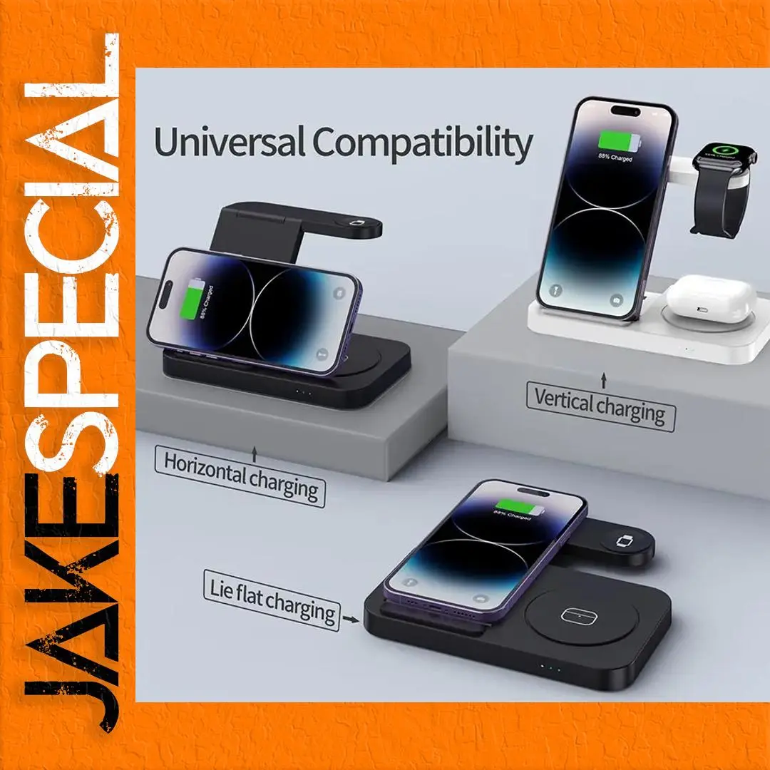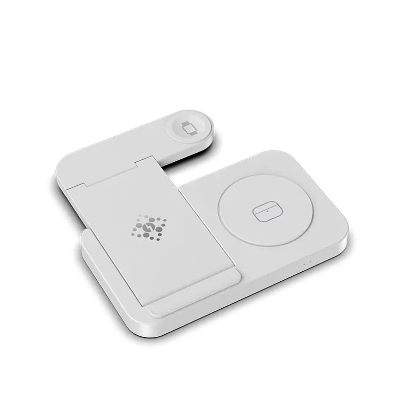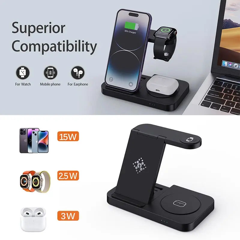 Introducing the 4-in-1 foldable wireless charging station, designed for ultimate convenience and style. Compatible with Apple iPhones (models 12 to 16) and Samsung Galaxy Watches (models 4 and 3), this charging station offers versatile charging for multiple devices, including smartphones, smartwatches, and earphones. Key specifications include an input of QC/PD 9V/2A and 12V/2A via a Type-C port, delivering a max output power of 20W. Measuring 167mm in length, 98mm in width, and 150mm in height, and weighing just 201g, it features a sleek two-tone color scheme available in black or white, with a circular horizontal charging pad and an adjustable upright phone stand, complete with a charging indicator for real-time status.