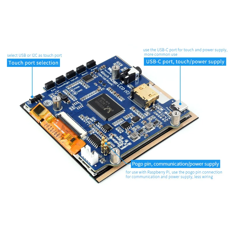 - Equipped with onboard dual touch circuitry supporting USB Type-C or I2C touch interface options, adapting effortlessly to different devices and scenarios for expanded capability.