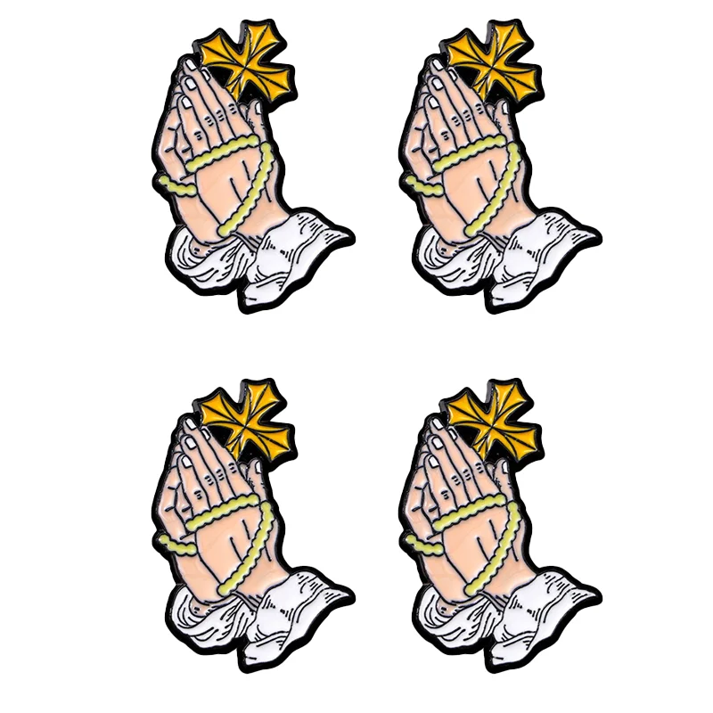 - Four distinct enamel pin designs featuring praying hands.