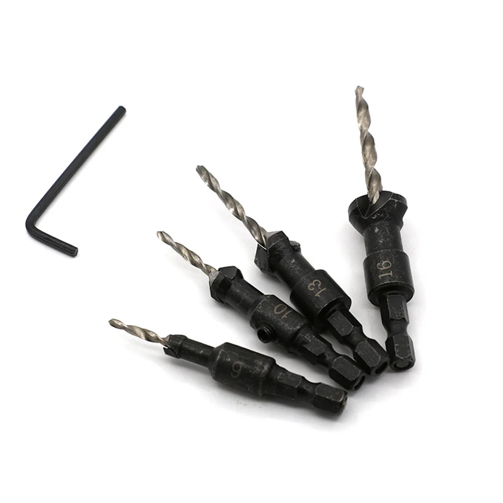 Experience professional precision with this sleek, four-piece countersink drill set designed for woodworking enthusiasts. Each drill bit features twisted, high-speed steel (HSS4241) tips with a shiny silver finish, paired with robust steel bodies. The set includes sizes 6, 10, 13, and 16, corresponding to 3mm, 3.5mm, 4mm, and 4.5mm diameters respectively. The black, matte hex shank (6.35mm) offers quick-change compatibility with standard drills, ensuring versatility. An adjustable countersink mechanism allows you to control depths easily with the included Allen wrench, providing smooth operation for precise screw holes and chamfers. Combining functionality with modern industrial aesthetics, this set is perfect for creating clean, accurate woodwork.