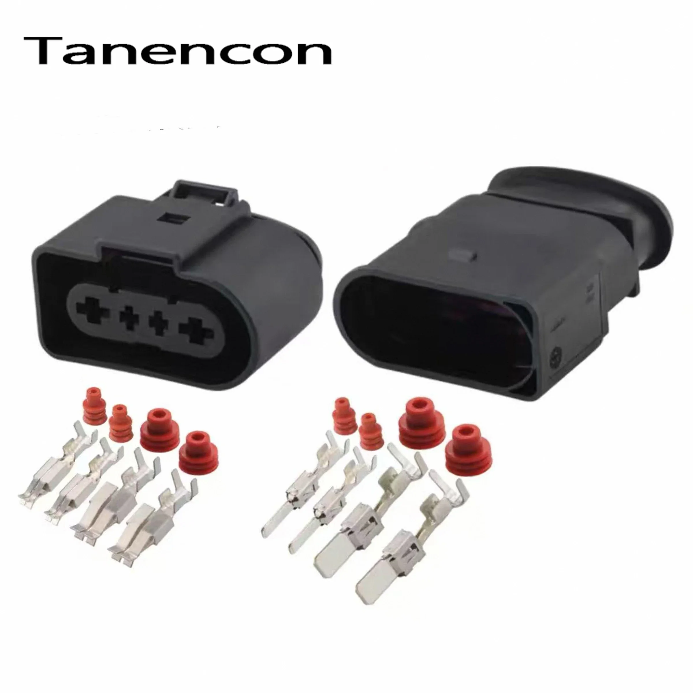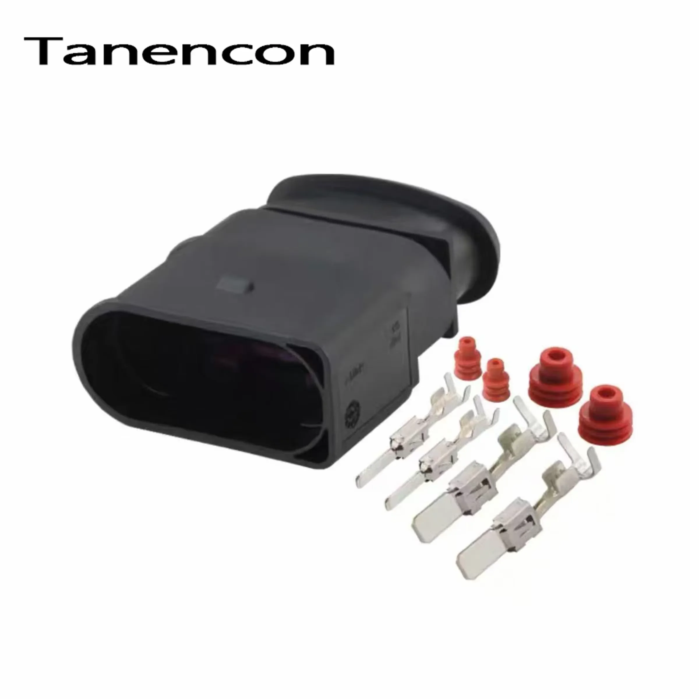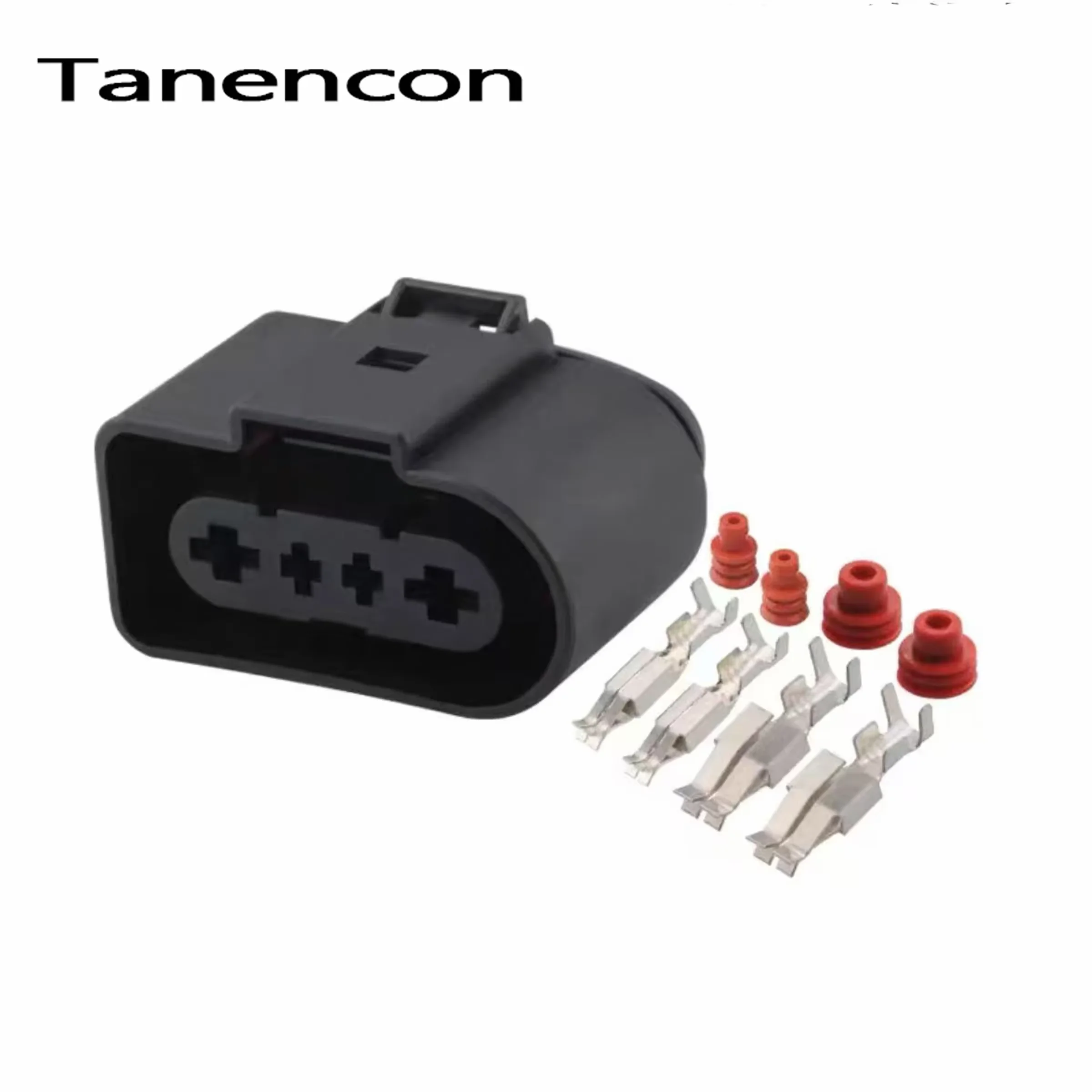 The 4-pin composite waterproof car connector is an essential component for ensuring reliable electrical connections in your Volkswagen vehicle. With a sleek matte black finish, this connector features a rectangular design with rounded edges and clear “+” markers for easy pin alignment. Alongside five shiny metallic terminals featuring split ends for a secure fix, the package includes three cylindrical red waterproof plugs for added protection against moisture. Available in sets of 1, 5, or 10, you can choose the quantity that best suits your needs, whether for repairs or upgrades. This connector guarantees durability and functionality, making it a smart addition to your automotive toolkit.
