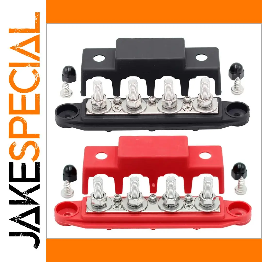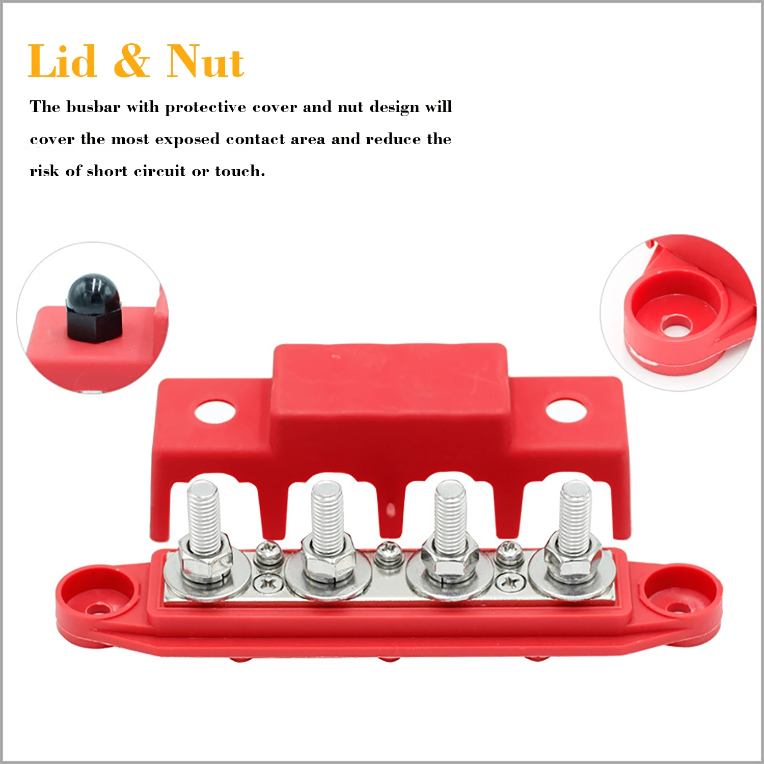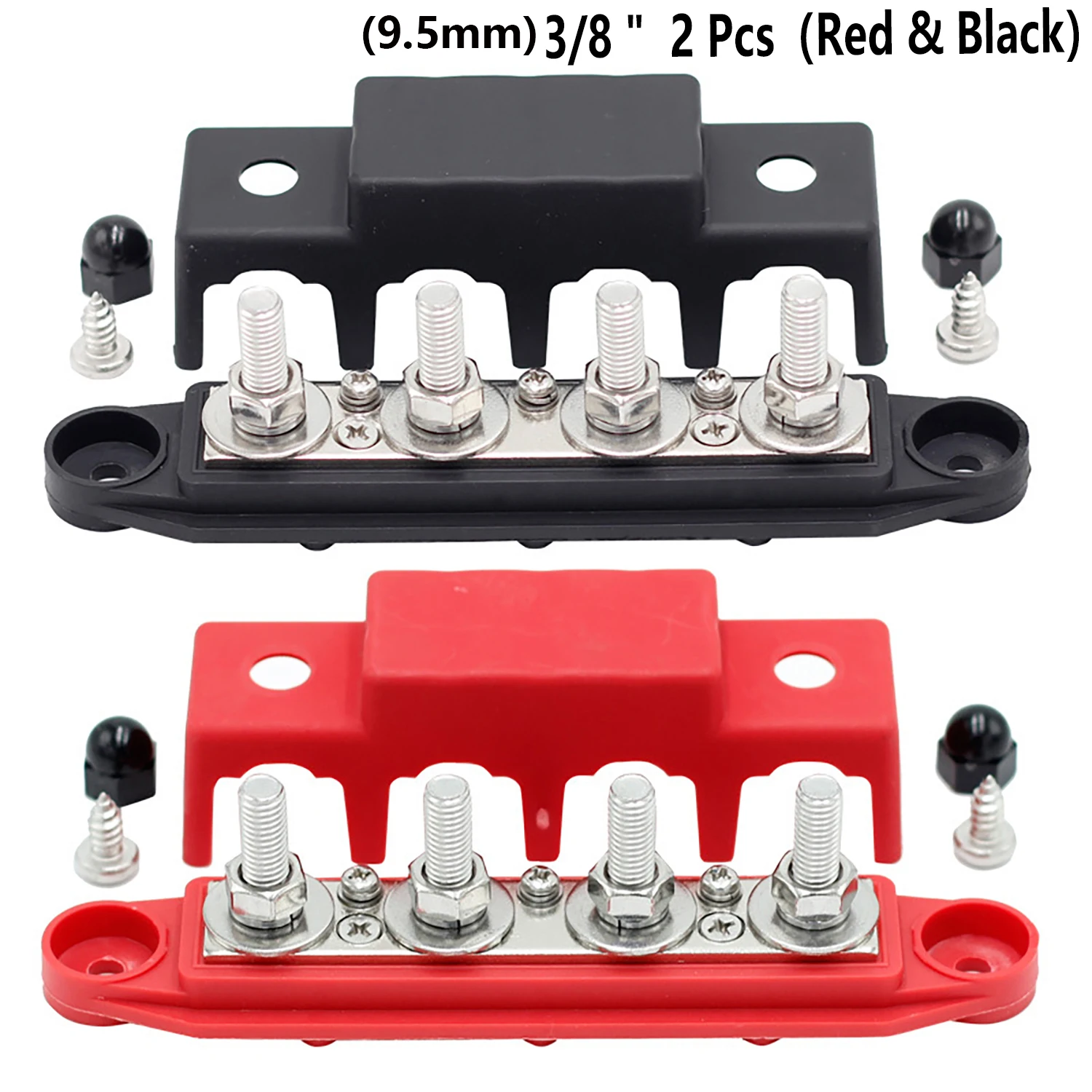 Experience reliable power distribution with this sturdy 4-post bus bar, designed specifically for marine, automotive, and solar wiring systems. Its sleek rectangular shape, rounded ends, and durable plastic construction offer both a modern look and high resistance to harsh environments. The black and red color options allow for quick identification and organization of wiring. Four evenly spaced, threaded metal posts ensure secure connections, supporting wire sizes of 5/16 inch and 3/8 inch. The included covers snap securely onto the bases, providing insulation and protection. With a maximum voltage of 48V and a rated current of 250A, this component guarantees safe, consistent electrical performance, making it an essential part of your power setup.