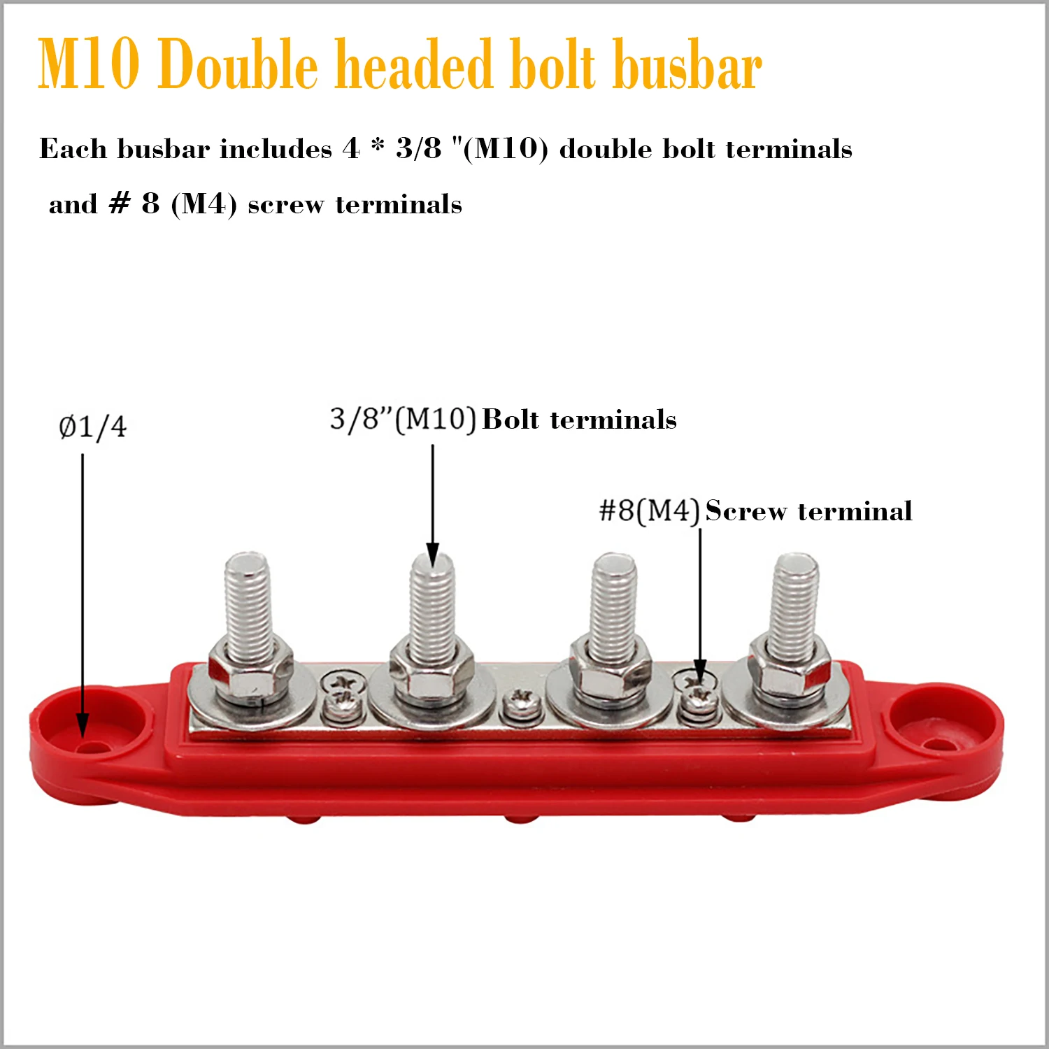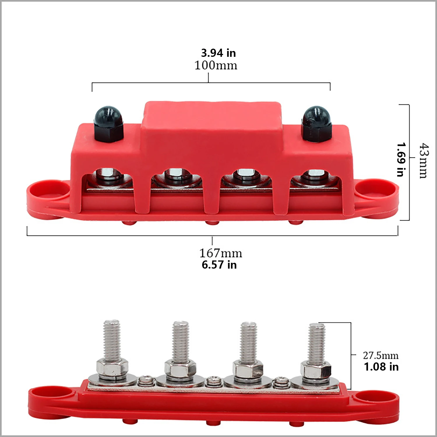 - Technical specifications: 4 metal threaded posts, maximum voltage 48V, current 250A, support wire size 5/16″ and 3/8″, materials include durable plastic and metal, color options black and red.