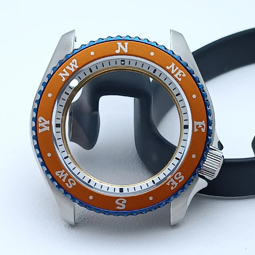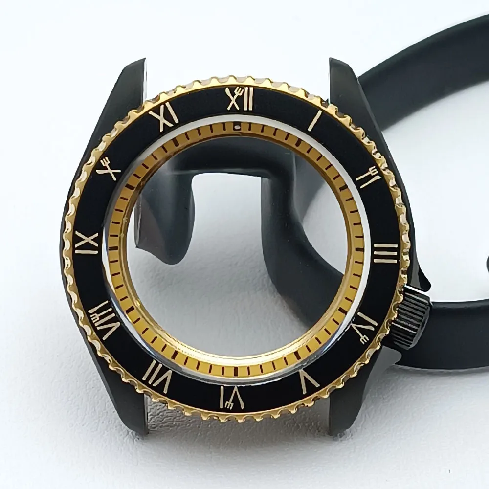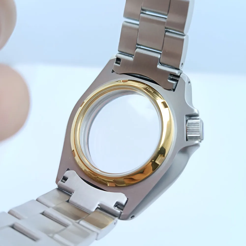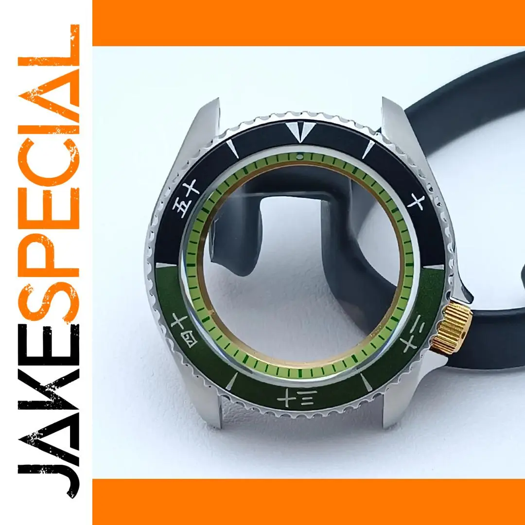Experience the perfect blend of style and durability with this high-quality 40.5mm stainless steel watch case. Crafted from 316L stainless steel, it boasts a polished silver finish that exudes modern elegance. The case features a prominent, textured bezel with a knurled edge, adding a rugged feel, complemented by a striking black and green insert with detailed markings, symbols, and Chinese characters that evoke technical sophistication. The gold-colored crown provides an attractive contrast and ease of adjustment. Its curved sapphire crystal offers excellent clarity and scratch resistance, enhancing the overall luxurious appearance. Designed to support versatile customization, this case easily integrates with various dials and logos, making it ideal for sports or diver's watch enthusiasts seeking a unique, reliable timepiece.