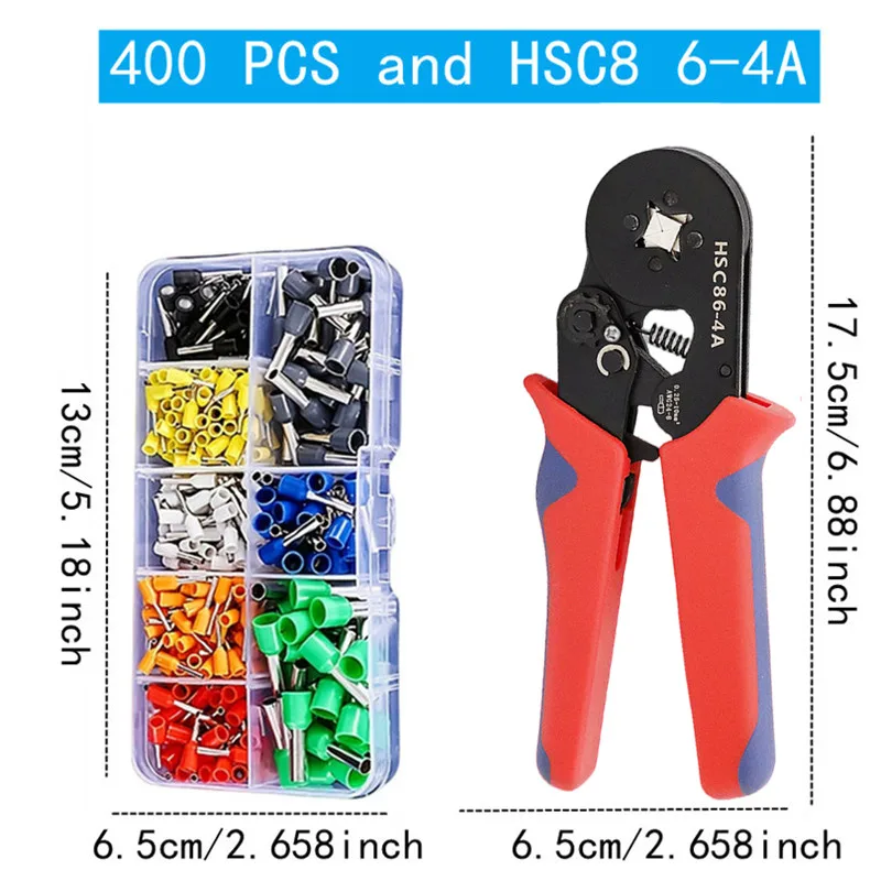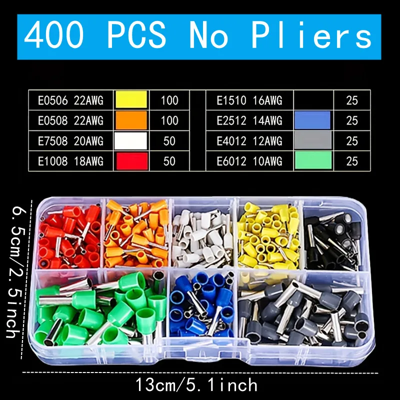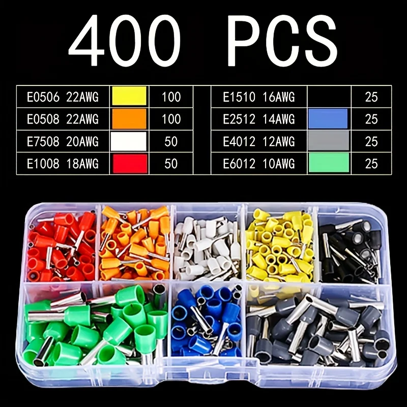 Enhance your electrical projects with this set of 400 insulated tubular crimp terminals, perfect for wire termination and electrical connections. These versatile connectors come in a vibrant range of colors, including red, orange, white, yellow, black, green, blue, and two shades of gray, organized neatly in a durable plastic storage box. Designed for compatibility with standard crimping tools, they ensure secure, reliable connections in various applications. Choose between options with or without accompanying crimping pliers to suit your needs. Crafted for adult enthusiasts and professional use, these high-quality terminals provide a practical, organized solution for wiring projects requiring precision and durability.