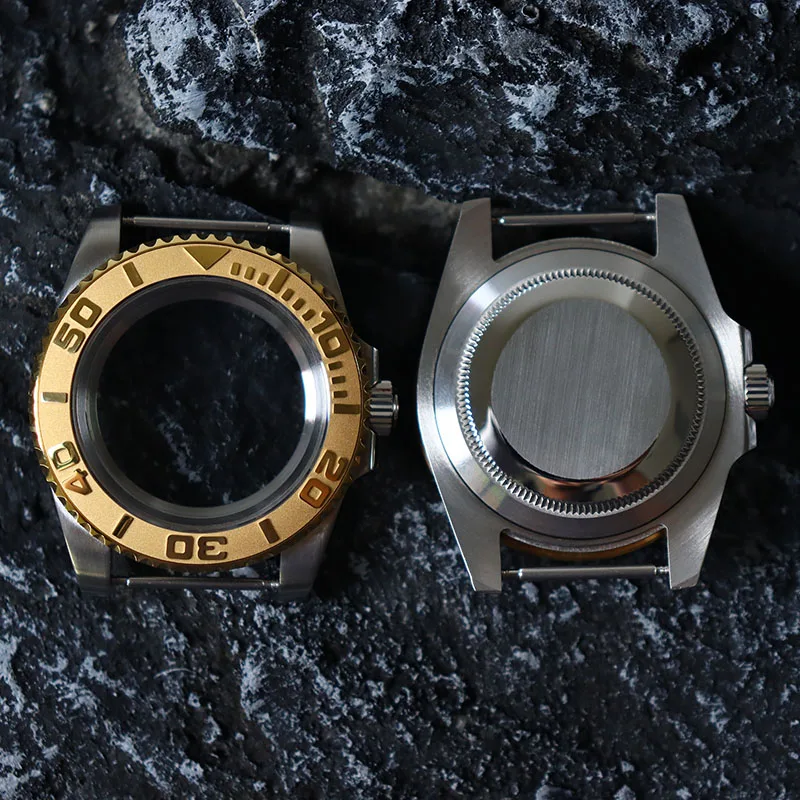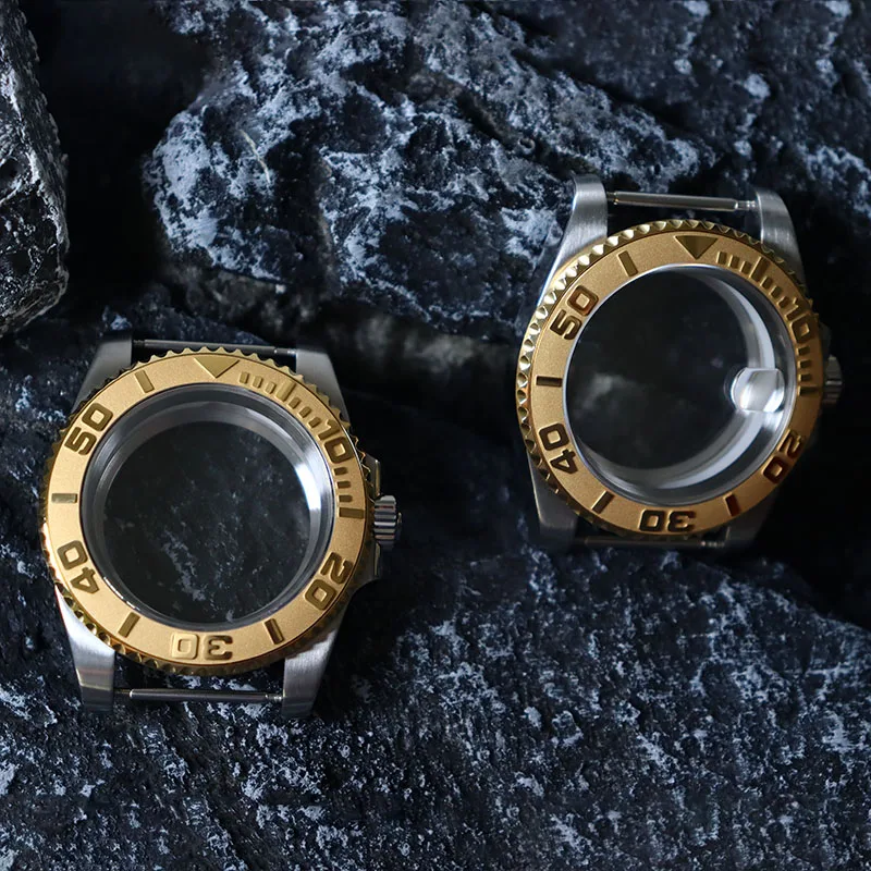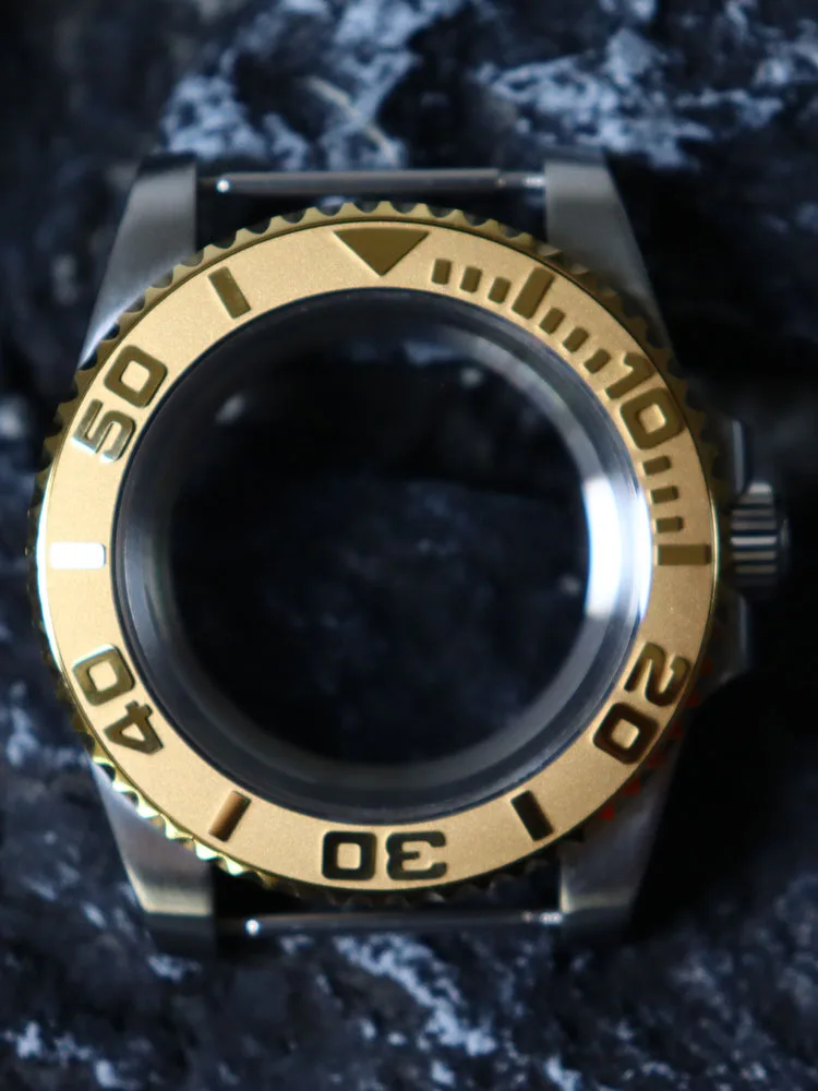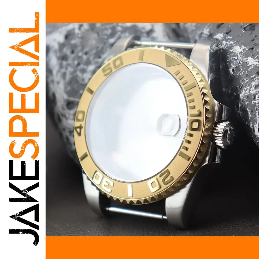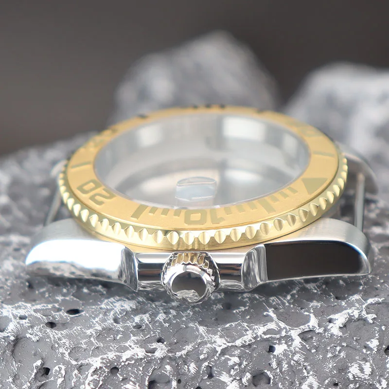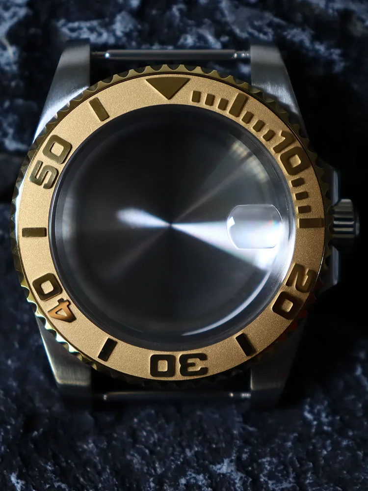 Experience a blend of elegance and durability with this expertly crafted 40mm watch case, ideal for nautical-inspired designs. Made from solid 316L stainless steel, it features a matte-finished, gold-toned ceramic bezel with engraved numerals and a textured gear-like edge, adding a touch of rugged sophistication. The polished stainless steel case has a sleek presence, measuring 13.2mm in thickness, and is topped with a high-quality sapphire crystal glass, offering excellent scratch resistance and a slightly domed appearance. Designed for a perfect fit, it accommodates movements like NH34, NH35, NH36, NH38, 4R36, Miyota 8215 (including Miyota 8205), and ETA 2824 (including PT5000). Whether you want a transparent or solid case back, this case ensures waterproof protection up to 20 ATM, making it a reliable choice for adventurers and connoisseurs alike.