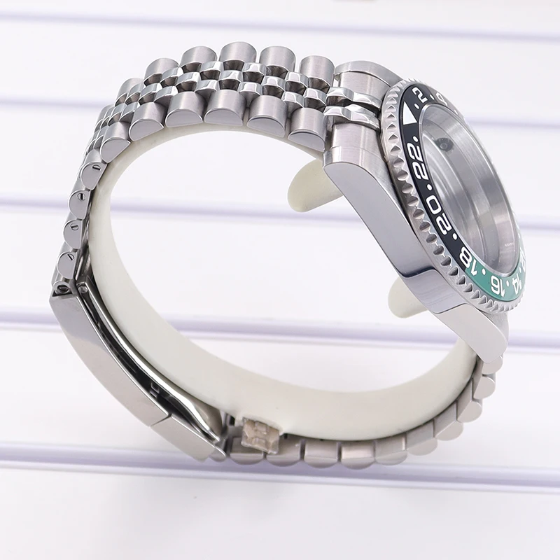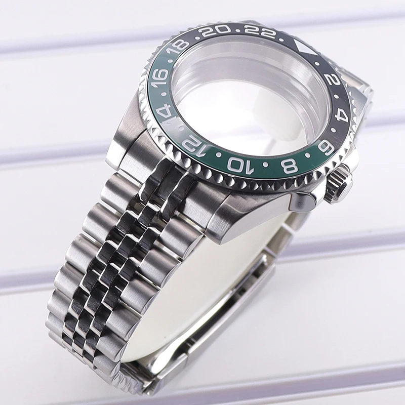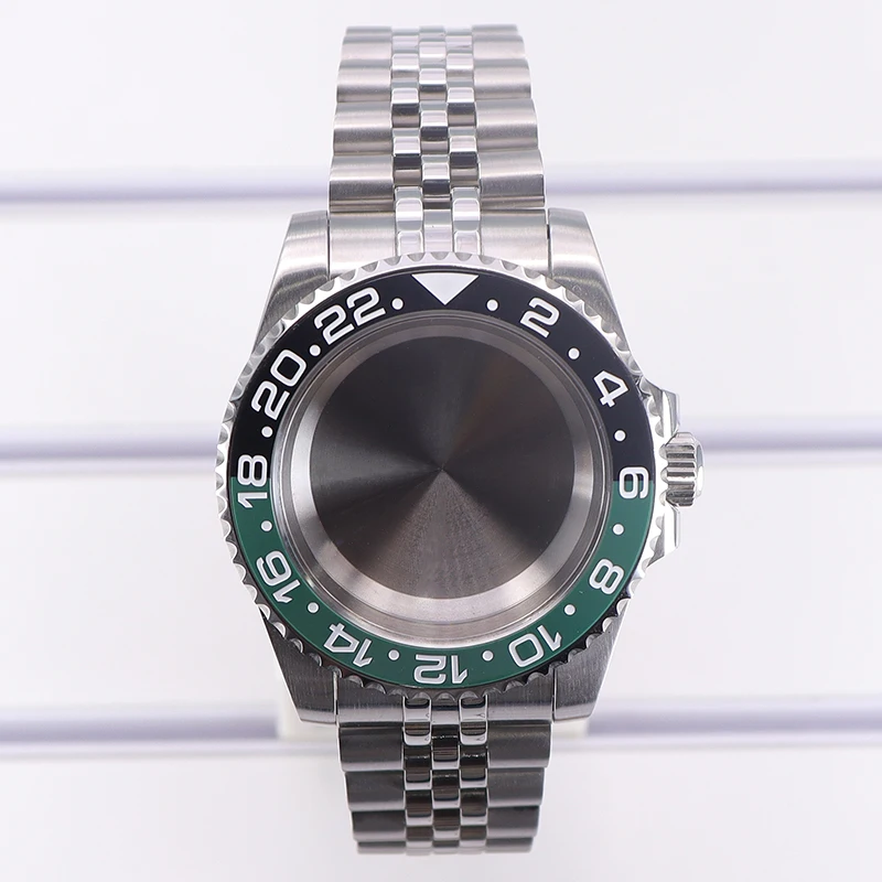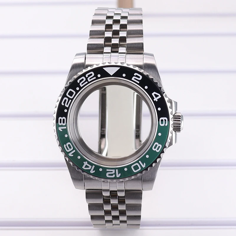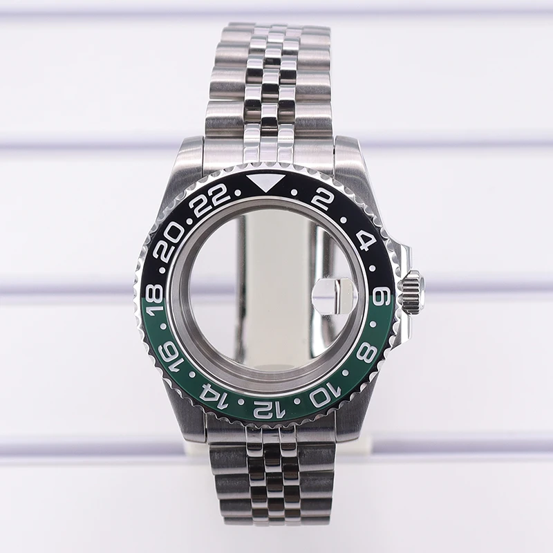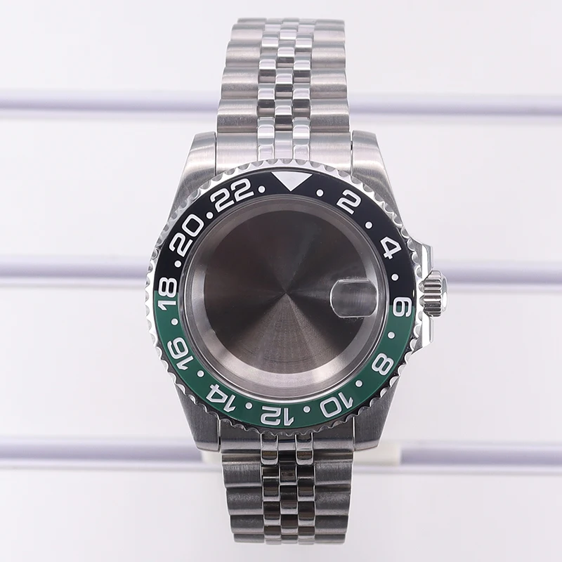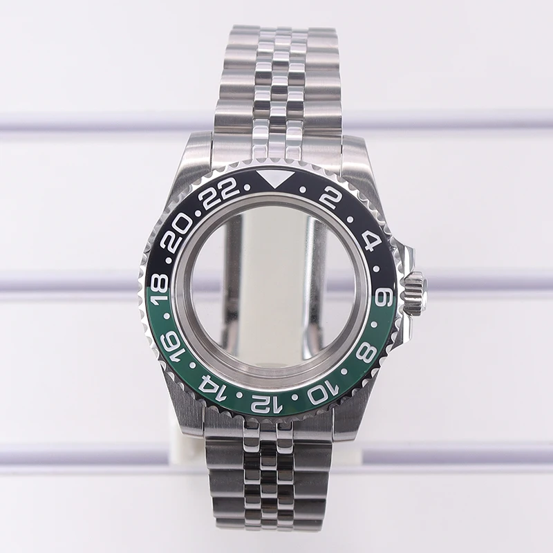 Experience precision and style with this stainless steel men’s diving watch case, featuring a 40mm diameter and 13.5mm thickness. Crafted from durable 316L stainless steel in a sleek silver finish, it includes a sapphire crystal glass with water resistance up to 100 meters. The ceramic bezel boasts a GMT scale with a split black and green design for striking visual contrast. Compatible with movements such as NH35, NH36, NH34, NH38, 4R36, Miyota 8215, 8205, and Eta 2824, it offers flexibility for custom builds. The watch case comes with a 20mm band width, solid or transparent bottom cover options, and components including crown, movement buffer seat, rubber seal, and spring strips, embodying durability and craftsmanship.