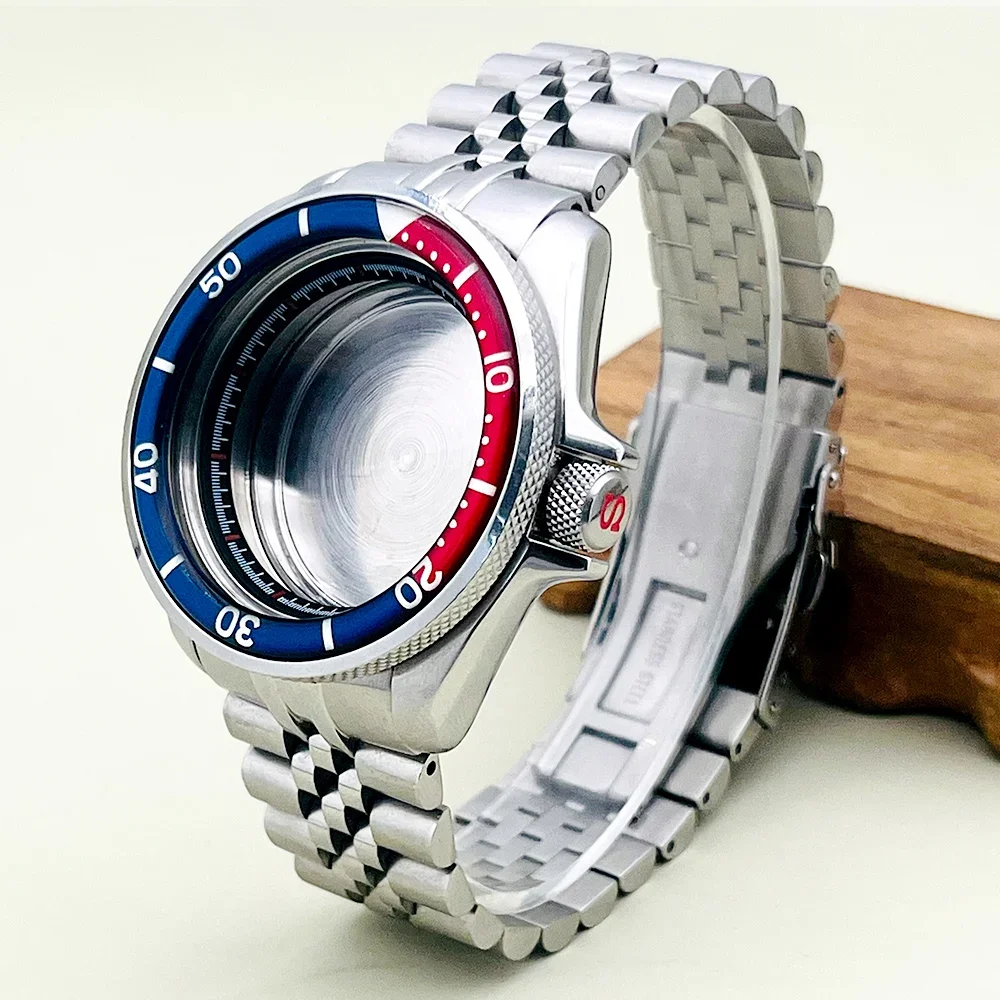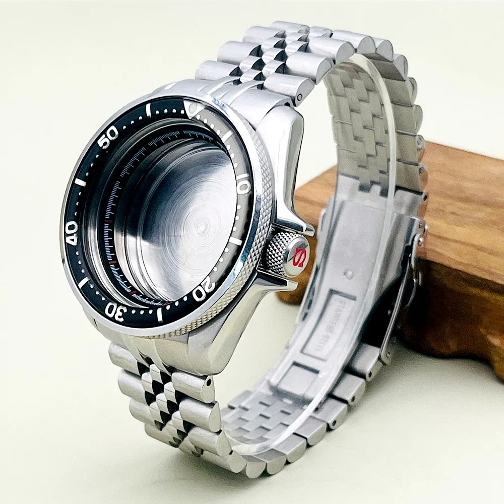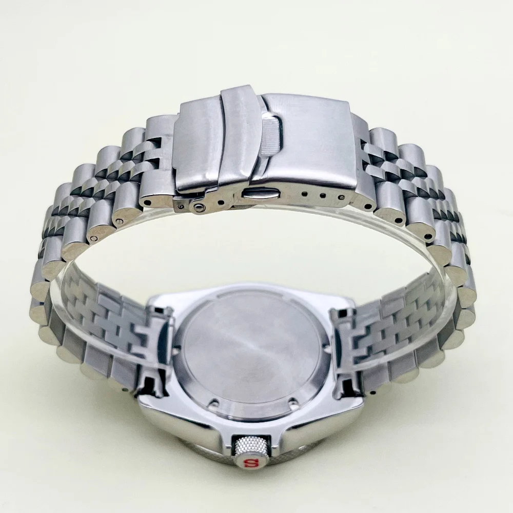 This stainless steel watch case, measuring 41mm in diameter and 13.5mm thick with a 46mm lug-to-lug length, offers a sleek, modern design with a polished finish. Crafted from durable 316L stainless steel, it features a flat sapphire crystal glass, a sealed waterproof back cover, and a screw-in lock crown at 3 o’clock. The bezel insert dimensions are 38mm by 31.5mm, and it is compatible with 28.5mm dials, supporting Japan automatic movements such as NH34, NH35, NH36, 4R35, and 4R36. Water-resistant up to 10 ATM, it is ideal for hand washing and swimming. The 22mm strap width is designed for a deployment folding clasp for secure wear.