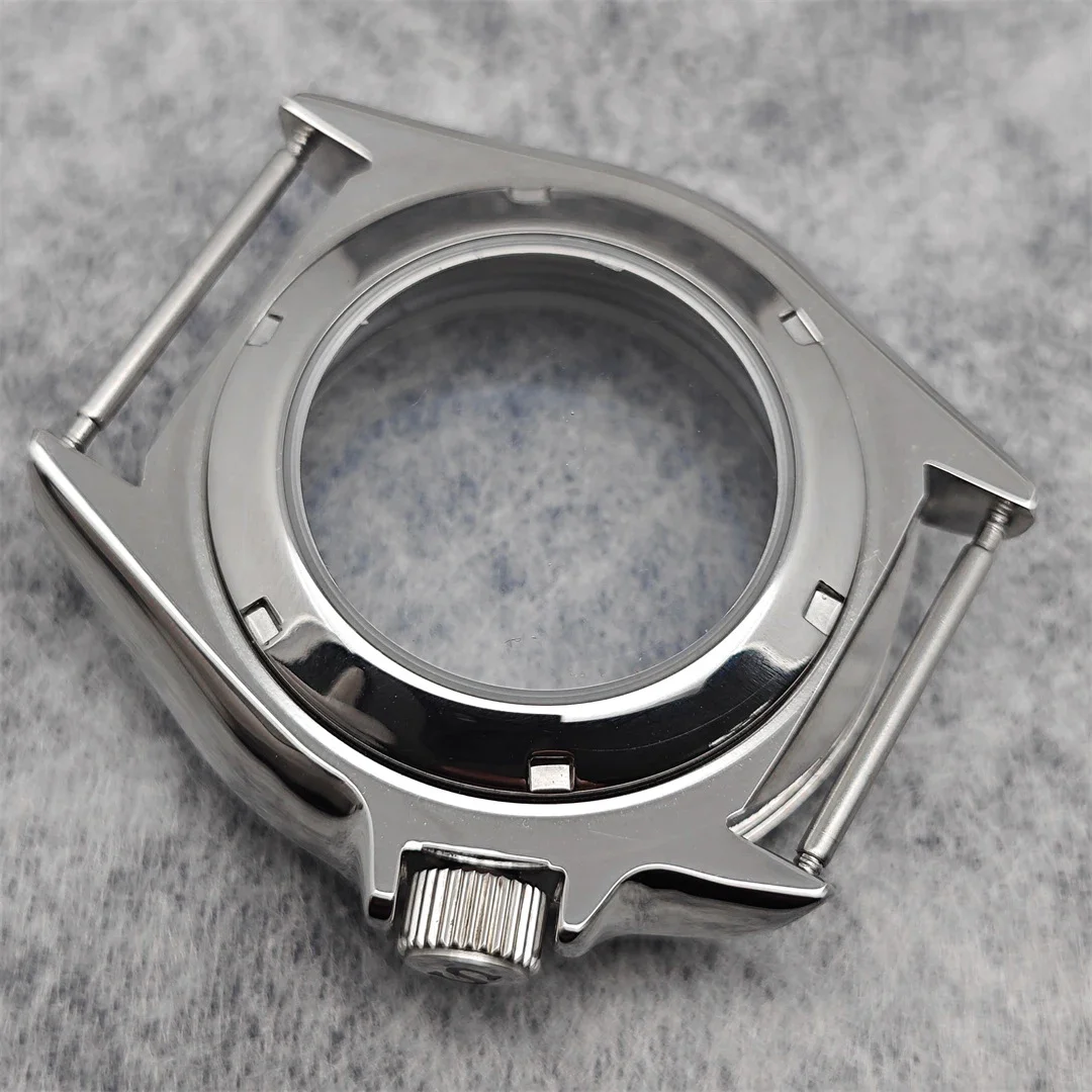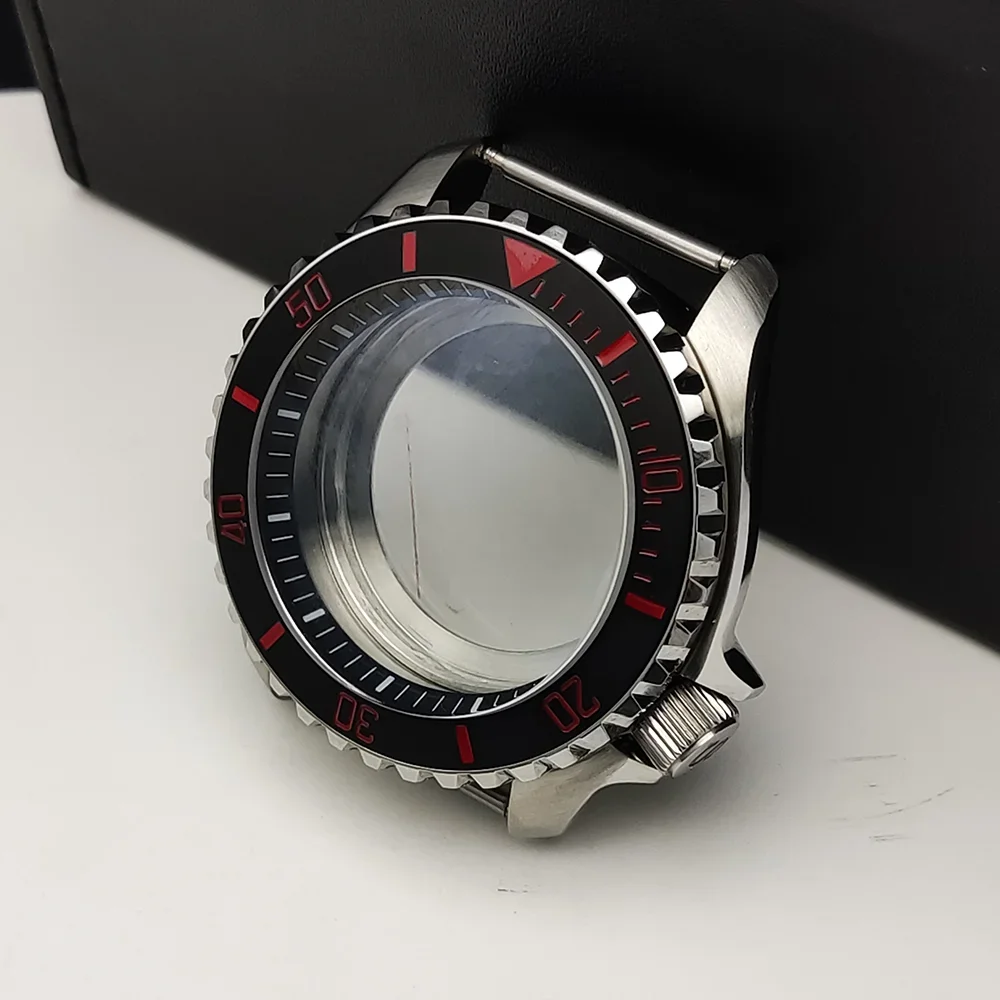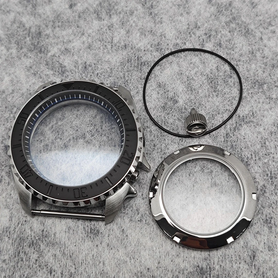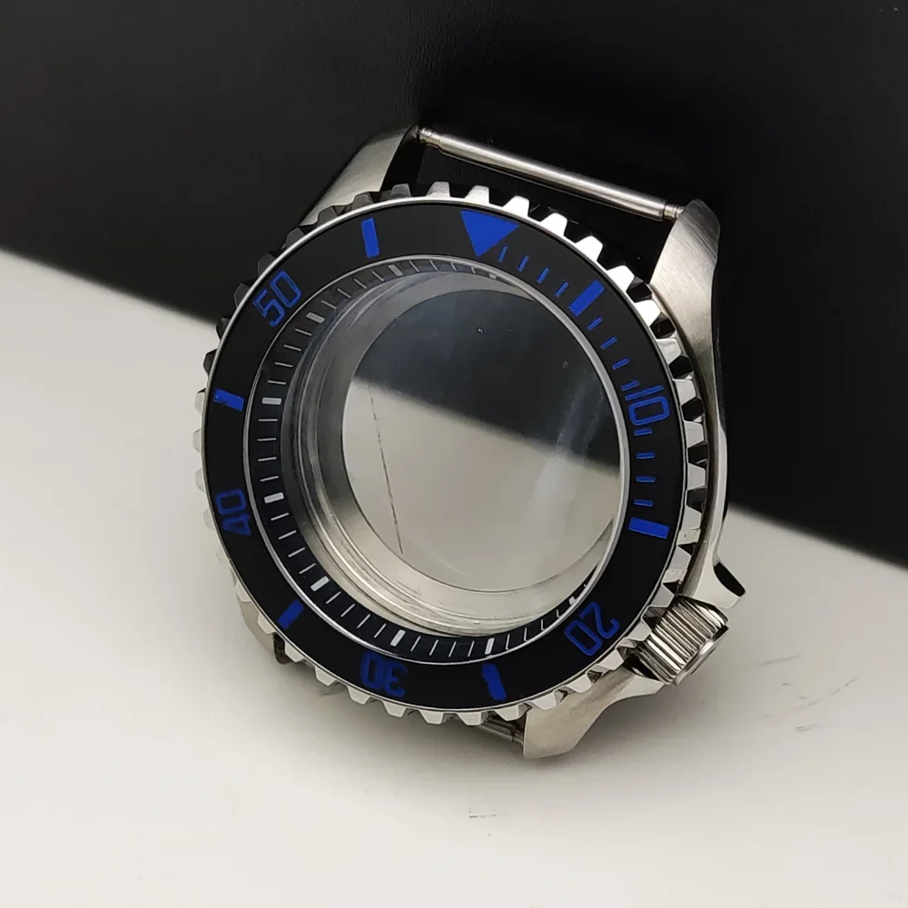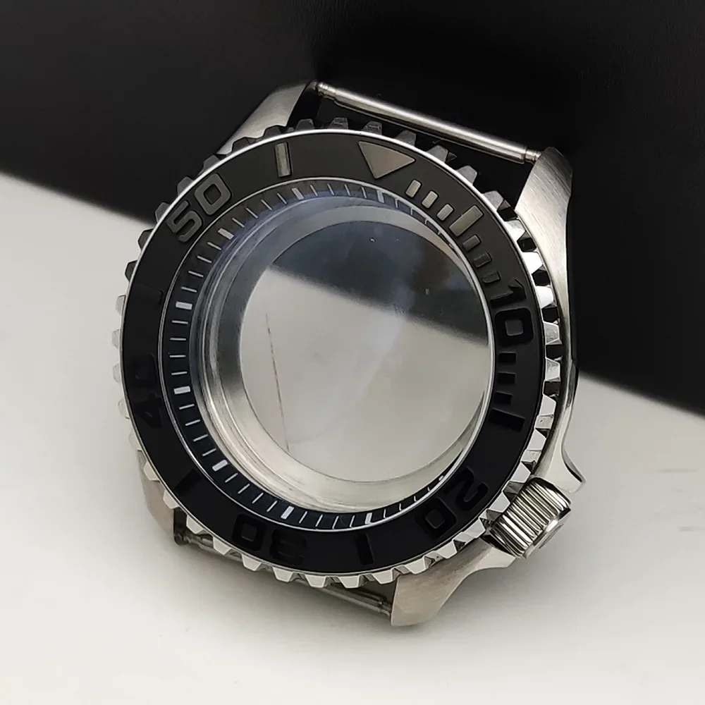 Imagine elevating your watch collection with this stunning 42mm stainless steel case, designed for ultimate durability and style. The brushed metal finish lends a refined matte look, perfectly balanced with the robust construction. The prominent black or dark grey unidirectional bezel, engraved with clear minute markers and large numerals at every ten-minute interval, enhances readability and offers an industrial, high-performance aesthetic. The raised sapphire crystal, tinted deep sapphire blue and double thickened for extra scratch resistance, complements the case’s overall sophistication. The knurled crown engraved with an “S” ensures easy grip for adjustments, while the lugs extend smoothly for attaching a 22mm strap. This case truly combines rugged toughness with modern elegance, ideal for personalized watch modifications.
