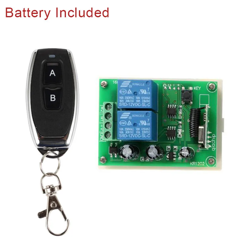 Experience seamless remote control with this reliable 433MHz dual-channel system, perfect for automation, gate, or lighting applications. Its compact design and organized green PCB layout ensure easy integration into various devices. The transmitter, model KT05-4, boasts a sleek white shell, measuring 59mm x 28mm x 8mm, powered by an included 3V coin cell. With a transmission range of up to 50 meters, it uses ASK modulation and learning encoding for secure, stable signals. The receiver, model KR1202-4, features a durable green PCB of approximately 7.3 x 5.3 x 2.0 cm, capable of operating from 5V to 60V DC input. It supports dry contact or voltage outputs with max 10A current, ideal for controlling motors, lights, or electronic gates. Designed for maximum flexibility, it supports momentary and toggle modes, ensuring it meets your precise control needs.