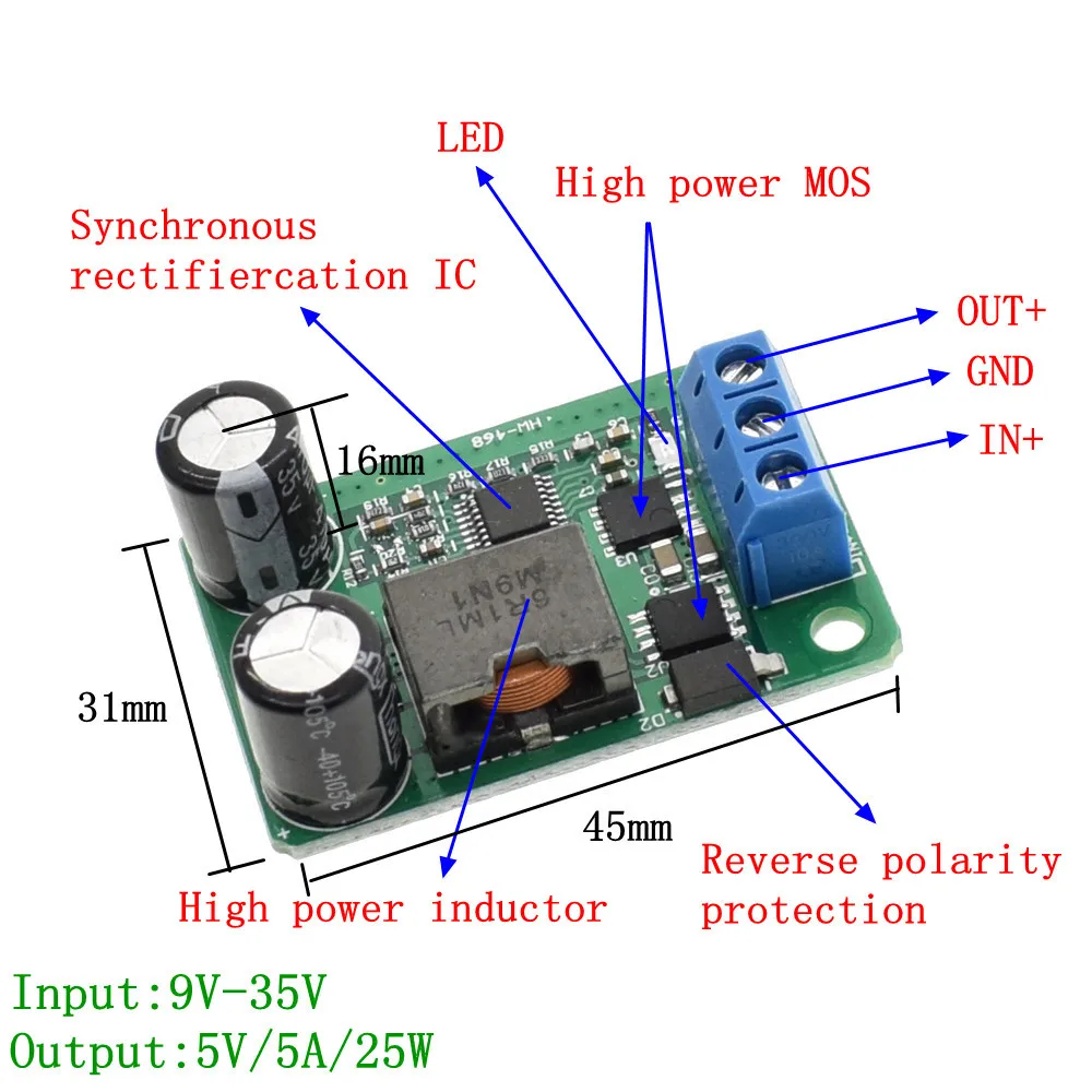 - Fixed output voltage of 5V with a current capacity of up to 5A, providing stable power delivery with a maximum output power of 25W for multiple applications.
