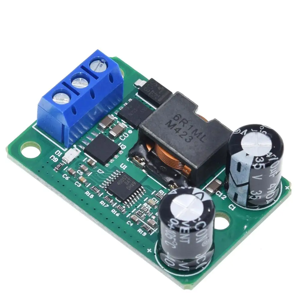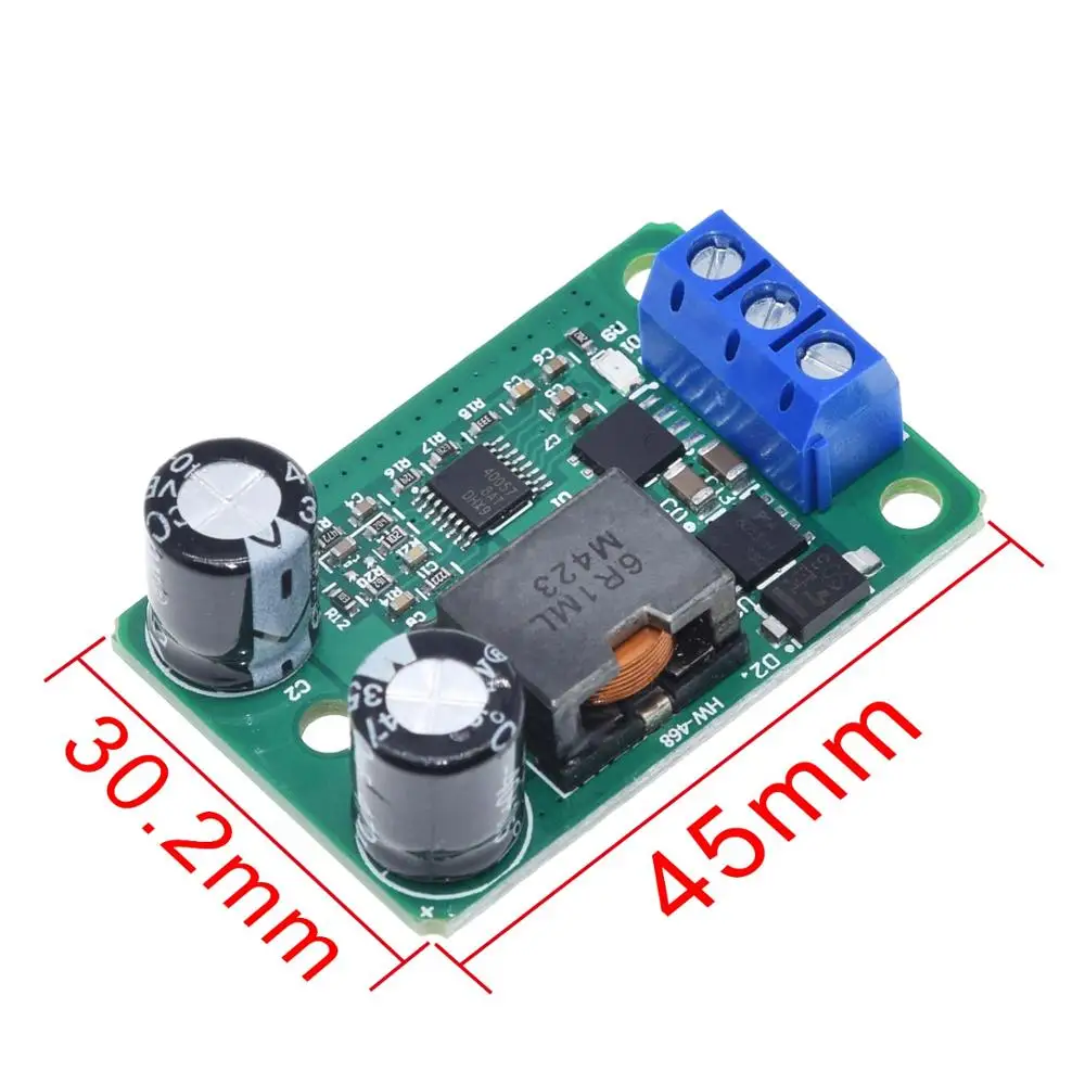 Experience reliable power regulation with this high-performance DC-DC buck converter module, designed for demanding electronic projects. Its compact size of 45x31x16mm allows easy integration into various applications, from sensor systems to switch controls. The vibrant green PCB backdrop not only adds a modern, industrial aesthetic but also emphasizes its technical precision. Large electrolytic capacitors with sleek black bodies and shiny silver tops deliver excellent filtering, while a copper-wound toroidal inductor showcases craftsmanship. Alongside miniature black IC chips and clearly marked terminals, this module offers a clean, organized appearance that inspires confidence. Whether you're creating custom power solutions or enhancing existing setups, this module supports your engineering needs with efficiency and style.