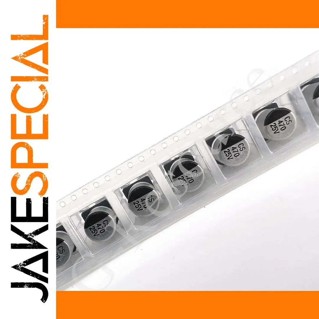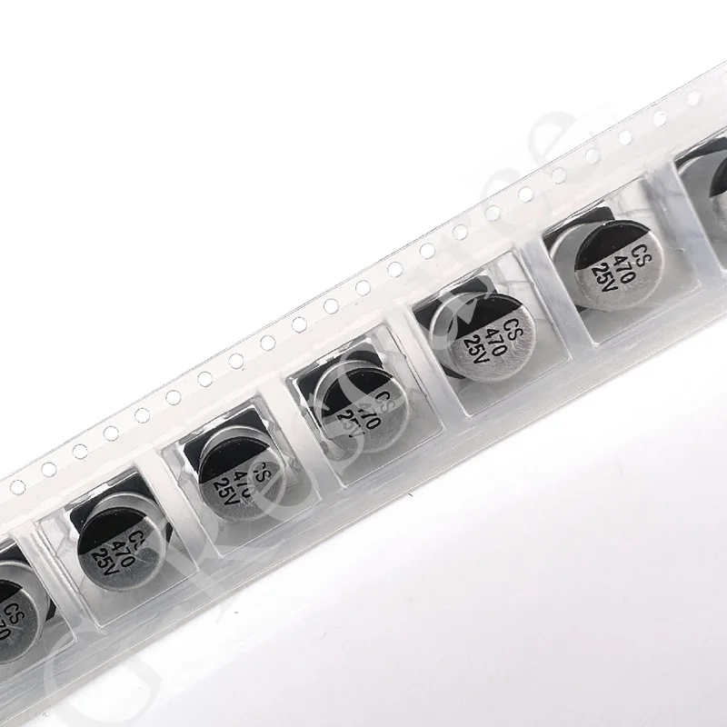 Imagine seamlessly integrating this high-quality aluminum electrolytic capacitor into your electronic designs. Featuring a shiny silver cylindrical body with smooth, rounded tops, it exudes a modern and industrial aesthetic. Its reflective surface ensures a clean, professional look, making your circuit boards appear organized and functional. The black printed text on the body provides precise specifications—”CS 470 25V”—for quick identification. Neatly arranged within a clear plastic strip, this component offers easy handling and placement. Its compact, surface-mount design makes it ideal for space-saving applications. Whether you’re constructing a new device or repairing existing electronics, this capacitor guarantees reliable performance and durability for your projects.