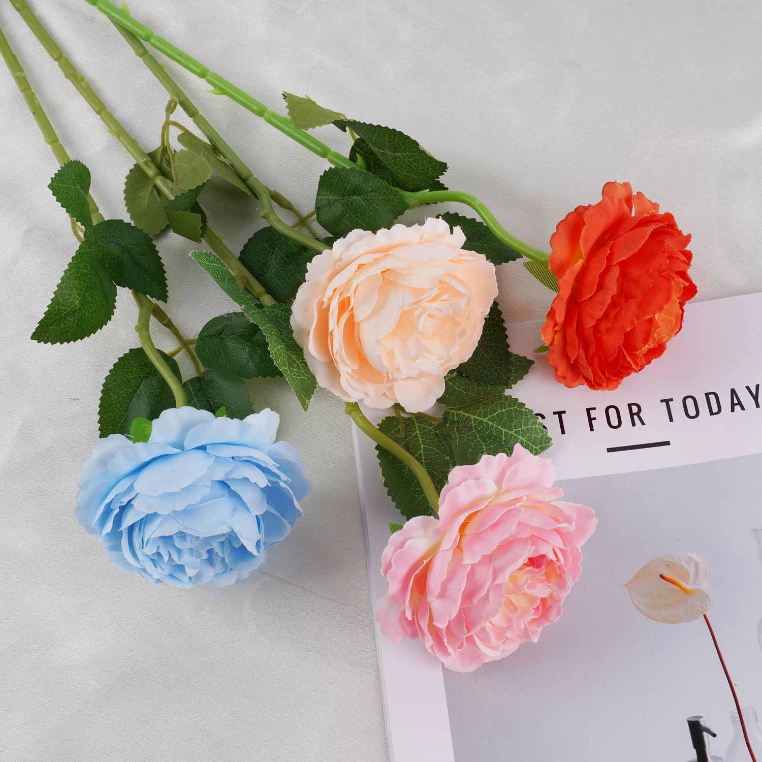 Transform your space with this stunning artificial pink roses arrangement, standing approximately 48cm tall. Crafted from high-quality silk and plastic, these lifelike flowers feature delicate, layered petals in soft pink tones with natural gradient variations. The slender green stems are textured for realism and are adorned with vibrant green leaves that have prominent veins and serrated edges, adding authentic detail to the bouquet. Ideal for creating a sophisticated ambiance, this arrangement is perfect for decorating weddings, home interiors, or special occasions. Its versatile color options—blue, champagne, light pink, light red, purple, red, and white—allow you to match any decor style easily. Enhance your events or living spaces with this timeless floral piece, designed to bring elegance and charm effortlessly.