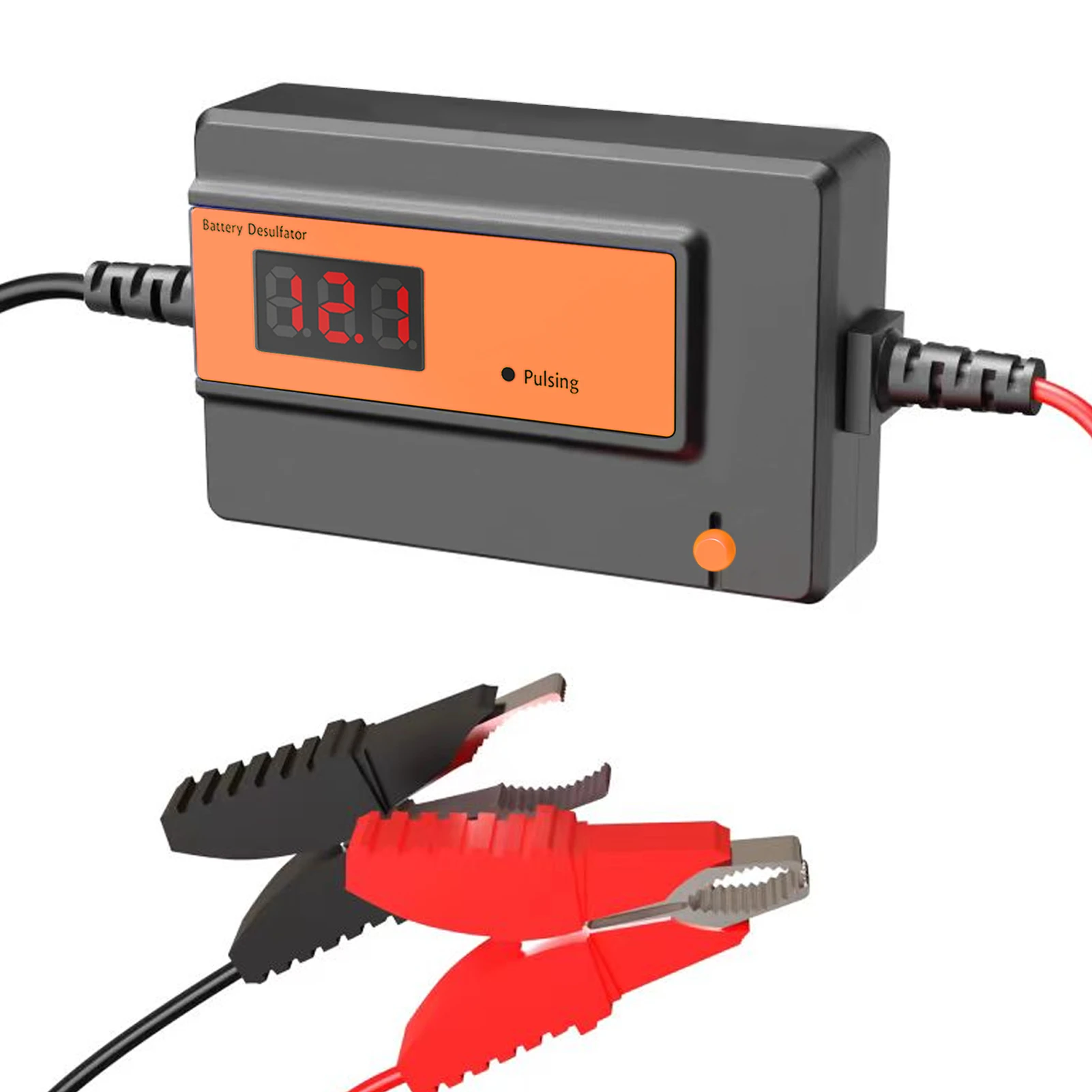 Experience reliable battery maintenance with this innovative 4A Battery Desulfator. Designed for various vehicles and equipment, it effectively reverses sulfate buildup in lead-acid, GEL, AGM, and other batteries up to 3 years old. Its sleek, modern rectangular shape features a dark gray or black matte finish, complemented by a bold orange front panel that highlights the digital voltage readout and pulsing indicator. The device's textured grips on the cables ensure a secure connection, while the minimalist aesthetic combines smooth lines with functional details for easy operation. With automatic voltage adjustment and multiple safety protections, this desulfator provides peace of mind, extending your battery's lifespan, enhancing performance, and reducing maintenance costs. Visualize your vehicle starting effortlessly and batteries lasting longer with this essential tool.