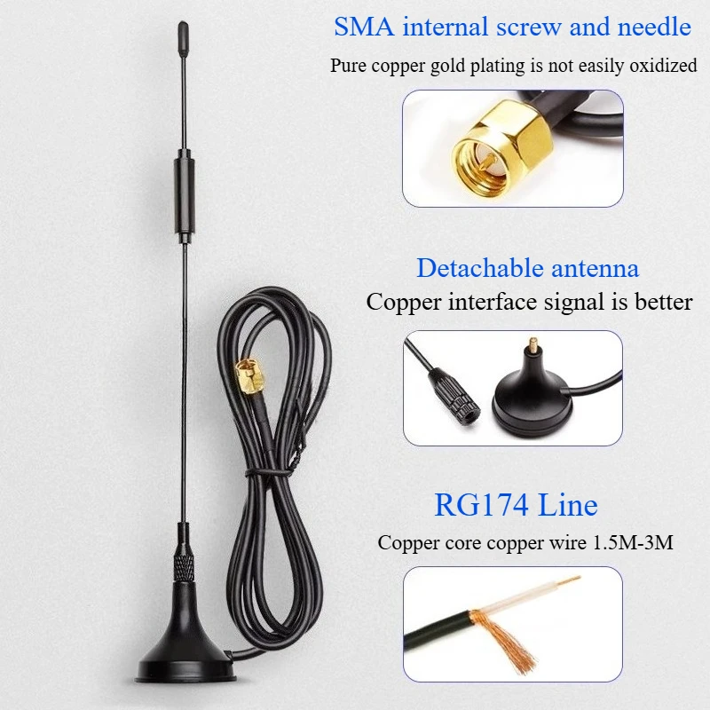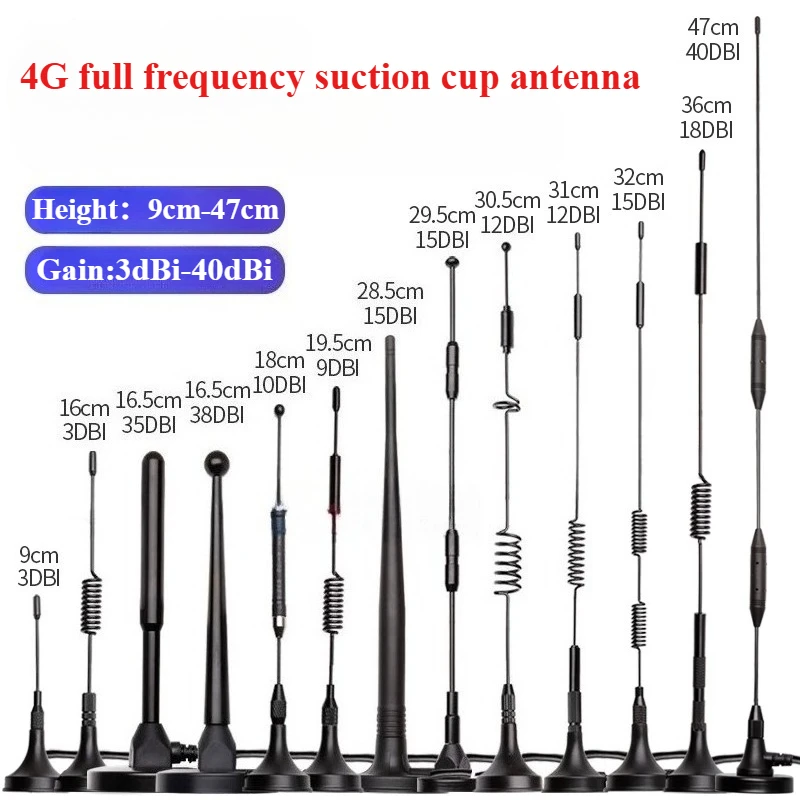 Enhance your wireless connectivity with this versatile collection of 4G and 5G antennas featuring gains from 8dBi to 30dBi, and lengths ranging from 9cm to 66cm. Designed for optimal signal reception, these antennas include models with 10dBi, 12dBi, 15dBi, 18dBi, 25dBi, and 30dBi gain, with specific sizes such as 16cm, 18.5cm, 20.5cm, 21.5cm, and beyond, incorporating RG58 coaxial cables for reliable performance. Compatible with 5V, 12V, 20V, and 30V power supplies, each unit features a durable SMA internal needle connector available in 1.5m or 3m lengths. Finished in matte black with technical coil or spiral elements, these sleek antennas combine functional elegance with advanced performance, perfect for upgrading your wireless network setup.