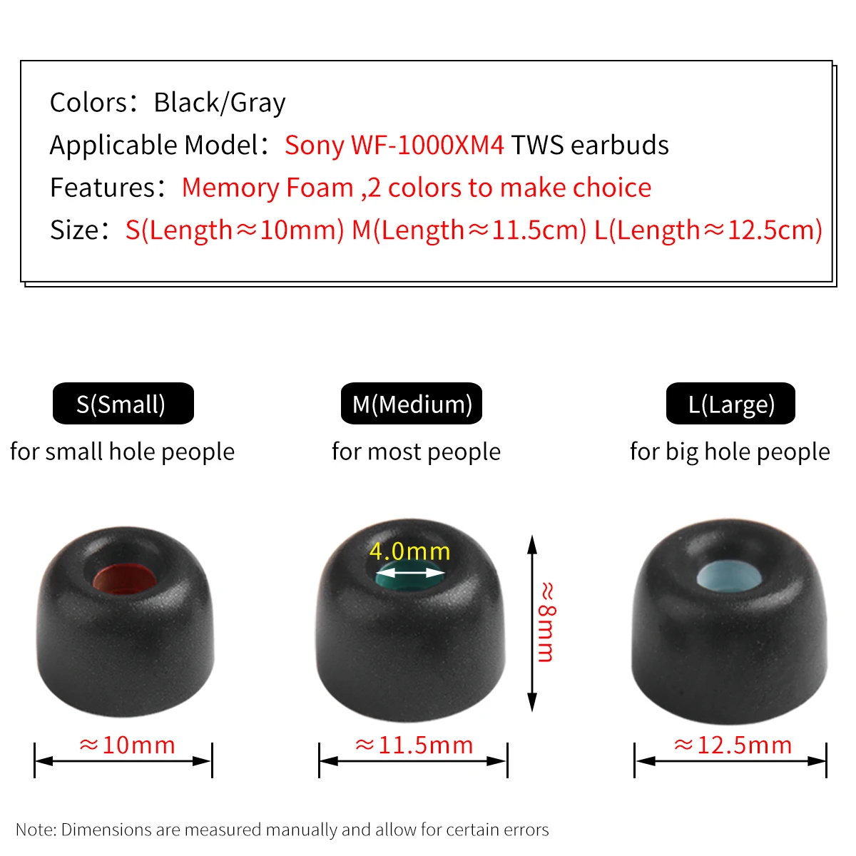 Enhance your audio experience with these 4PCS Memory Foam Ear Tips tailored for Sony WF-1000XM4 and compatible with other 4-5mm caliber headphones. Crafted from premium memory foam, they feature passive noise reduction for superior sound quality and a secure fit to prevent falling off. Available in sleek black or gray, these ear tips ensure long-lasting comfort, ideal for running, cycling, or everyday use. Choose from various sizes: M L (1 pair), S M (1 pair), S (2 pairs), M (2 pairs), or L (2 pairs). The set also includes an extra plastic storage bag for added convenience.