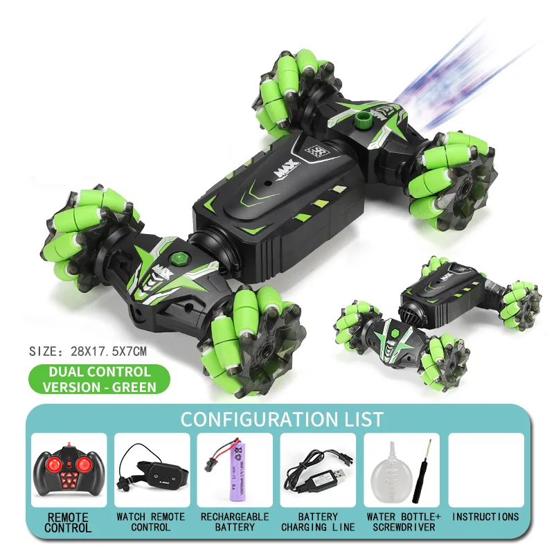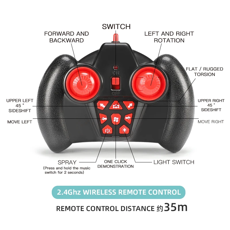 - This model supports a myriad of advanced functions: forward/backward, left/right turns, double-sided driving, rear spray, climbing, twisting, deformation, 360-degree rotation, and lateral movements combined with light and music effects for immersive play.
